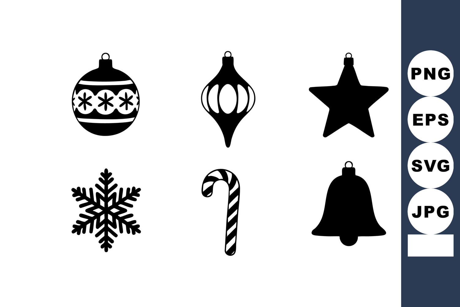 This vector illustration shows black silhouette Christmas tree ornaments including a star, bell, snowflake, candy cane, and round baubles with patterns in a simple style. Festive and minimal.