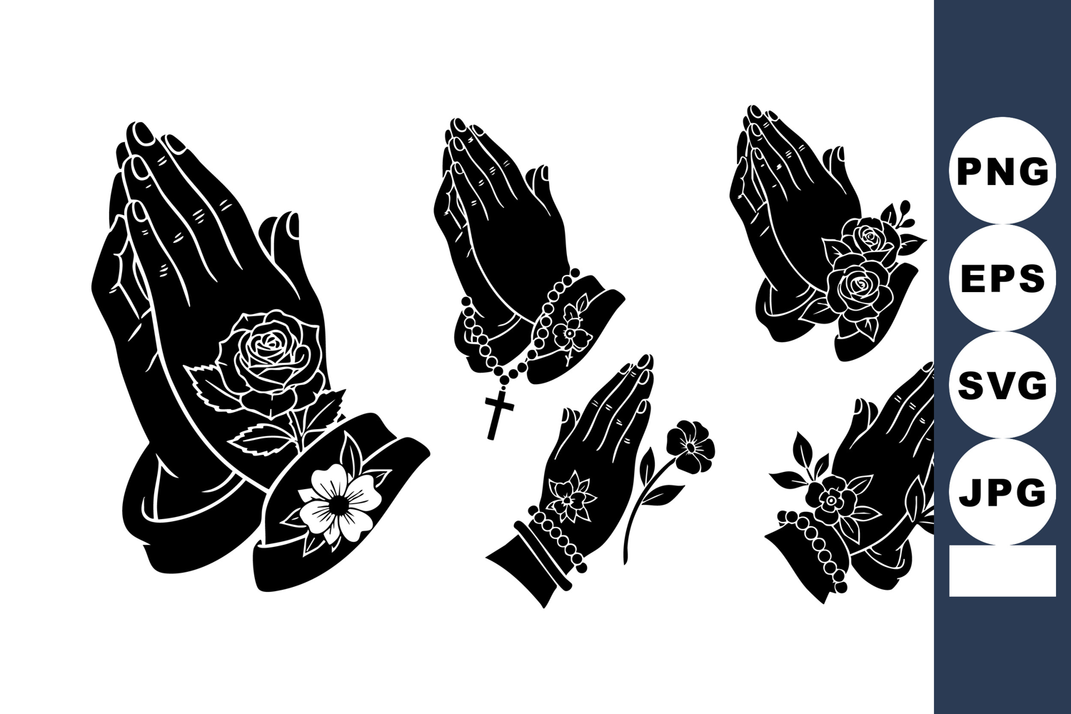 This vector image shows praying hands in black silhouette style adorned with roses, lilies, and rosary beads representing faith and devotion in a clean design. Spiritual mood.