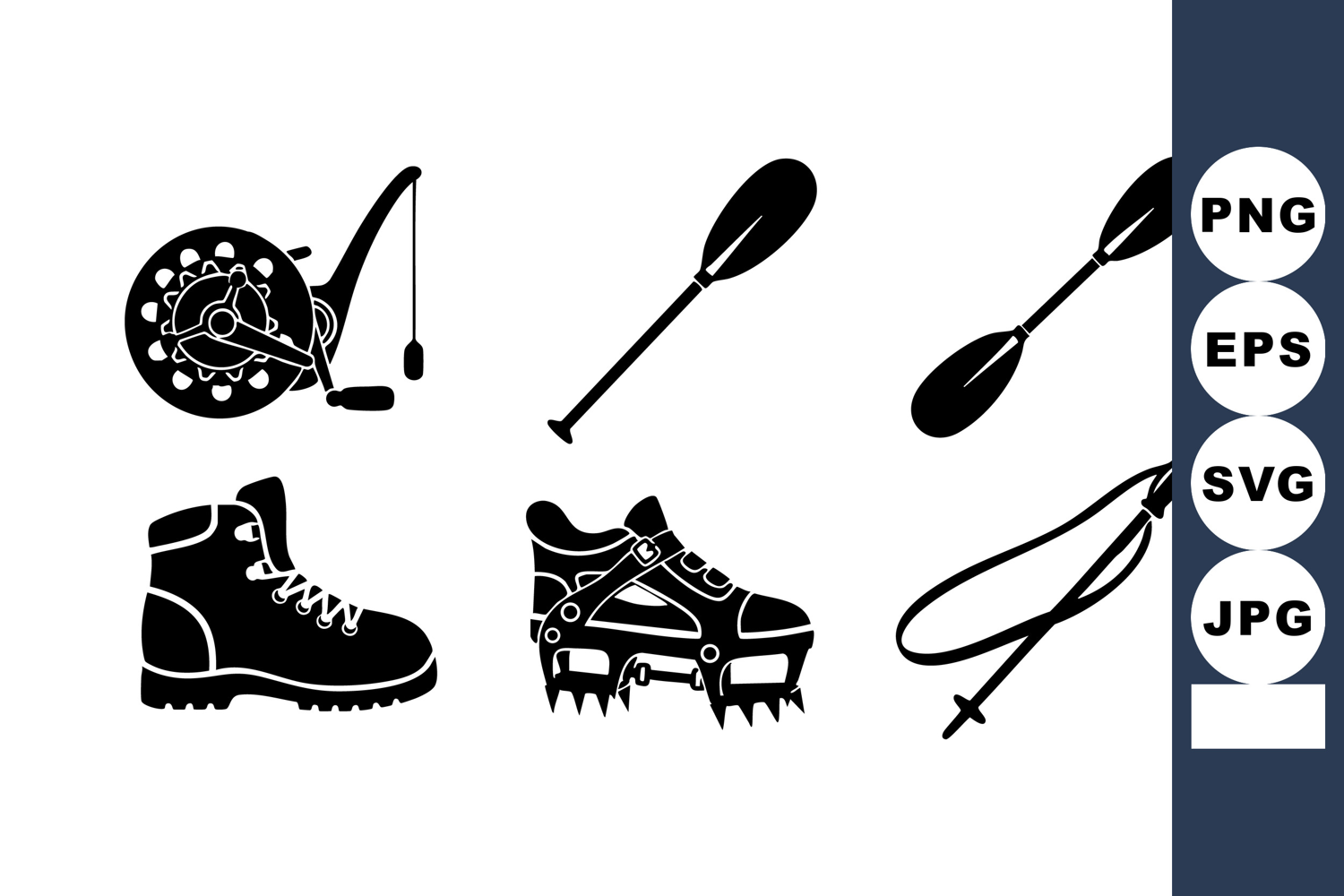 Black Silhouette Icons Gear Vector Illustration Outdoor Gear Vector Fishing Reel Paddle Paddle Oars Hiking Oars Hiking Boot Hiking Boot Cleats Boot Cleats Trekking Cleats Trekking Poles Trekking Poles Outdoor