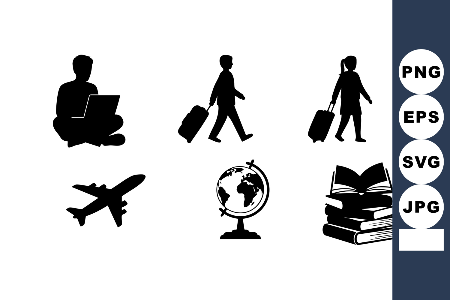 Black silhouette icons showing people with suitcases walking and sitting with laptop plus airplane globe and book stack representing travel and study concepts in simple style calm