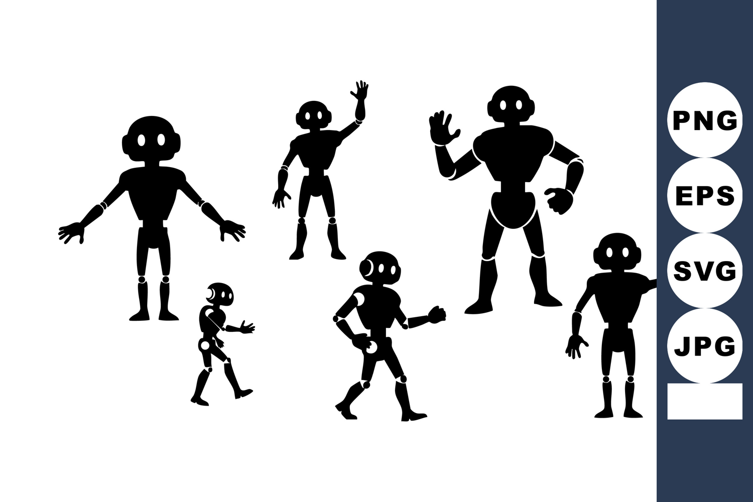 Illustration of six black humanoid robot silhouettes with various waving and standing poses on white background showing diversity in robotic gestures and design style friendly.