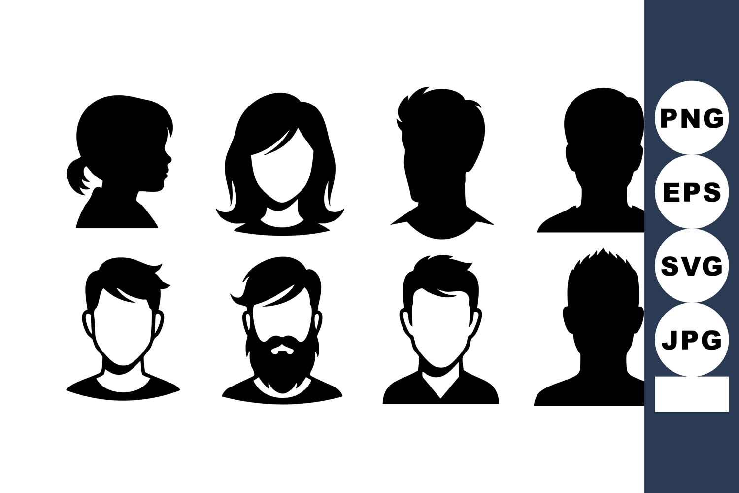 This vector illustration shows silhouette icons of male and female heads featuring various hairstyles and facial hair styles in black, designed for graphic use and digital projects. Stylish and versatile.