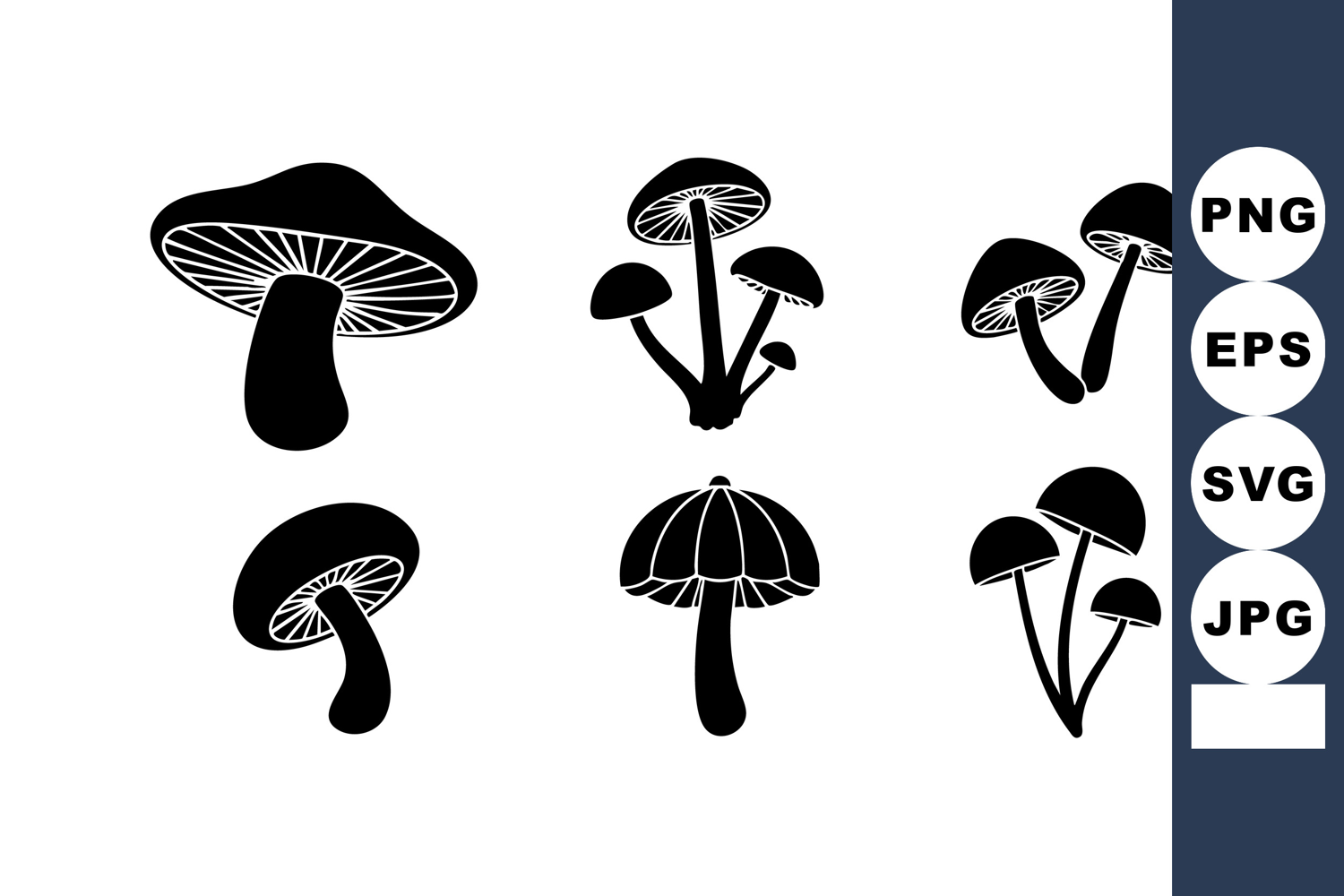 This vector set features black and white mushroom silhouettes in various shapes and sizes representing natural fungi design elements suitable for nature themed projects calm