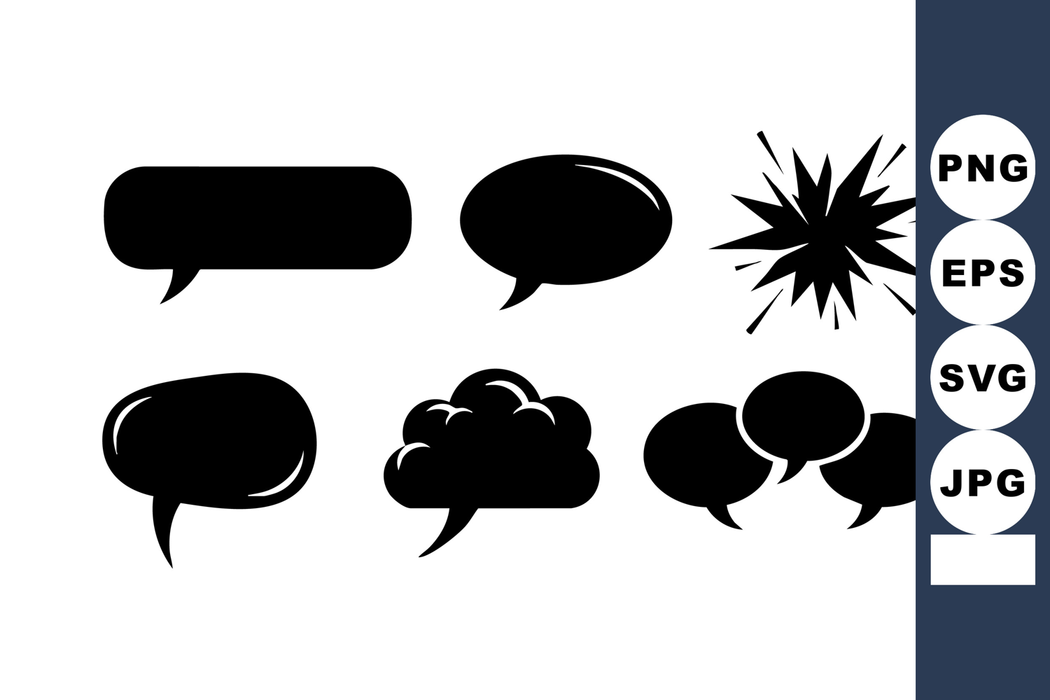 This vector illustration features six black speech bubbles and one explosion shape in a comic style used for design and communication purposes. The image is simple and expressive.