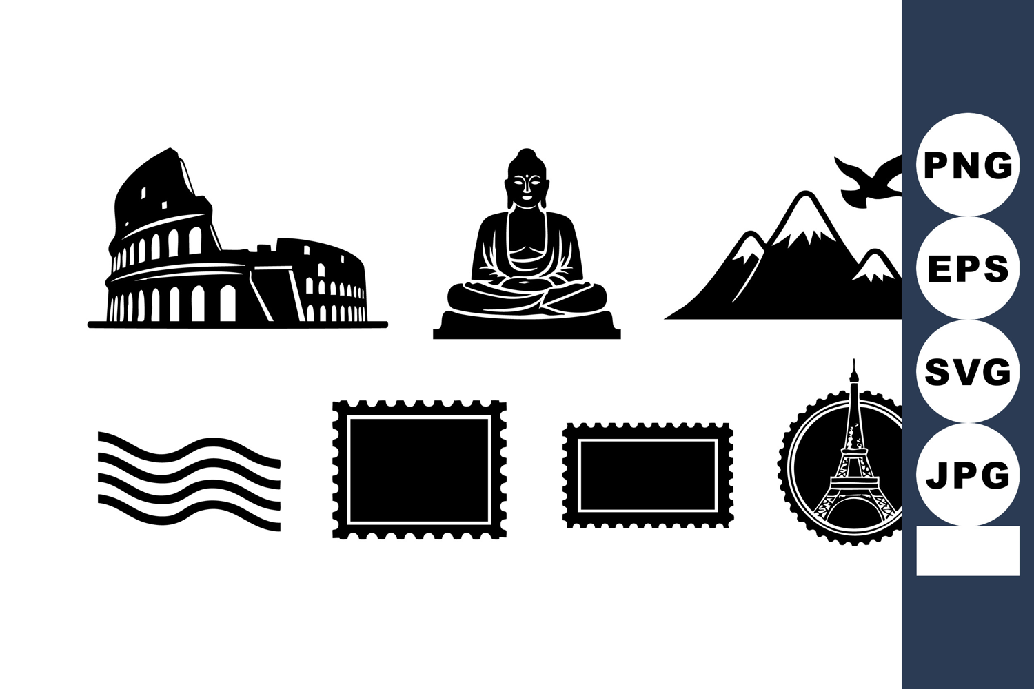 Travel Icons Set Postage Stamp Icon Vector Travel Icons Ocean Wave Icon Colosseum Travel Icon Buddha Statue Icon Mountain Bird Icon Eiffel Tower Icon Historic Monument Icon Modern Travel Illustration