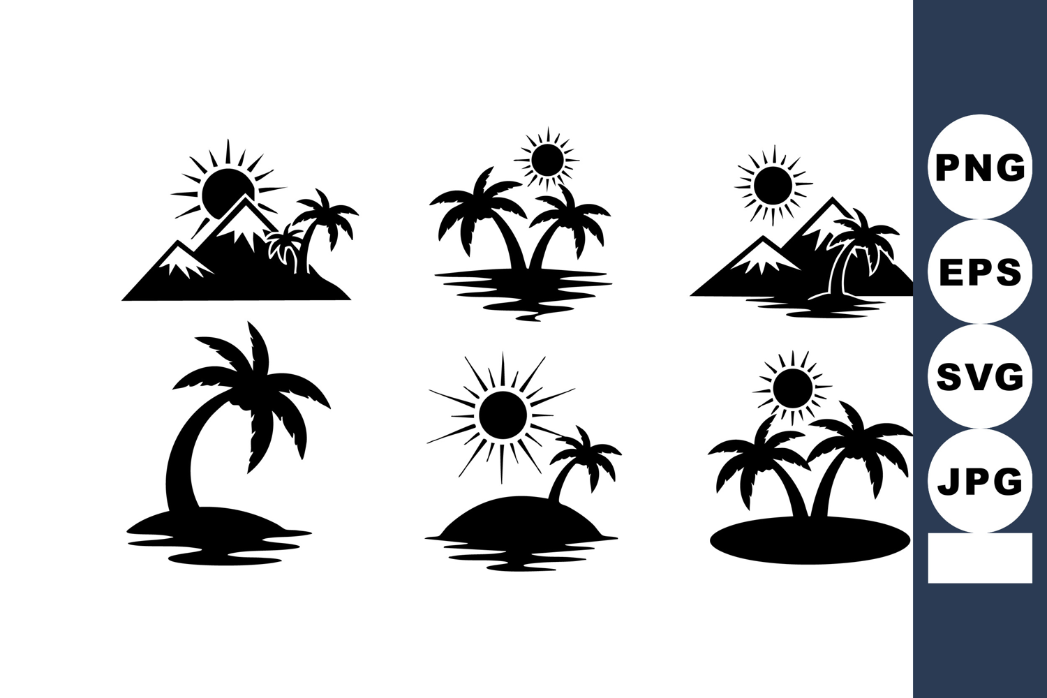 This vector features six black silhouette icons of tropical islands with palm trees and sun, symbolizing beach vacation and nature in a simple flat style, creating a calm mood.