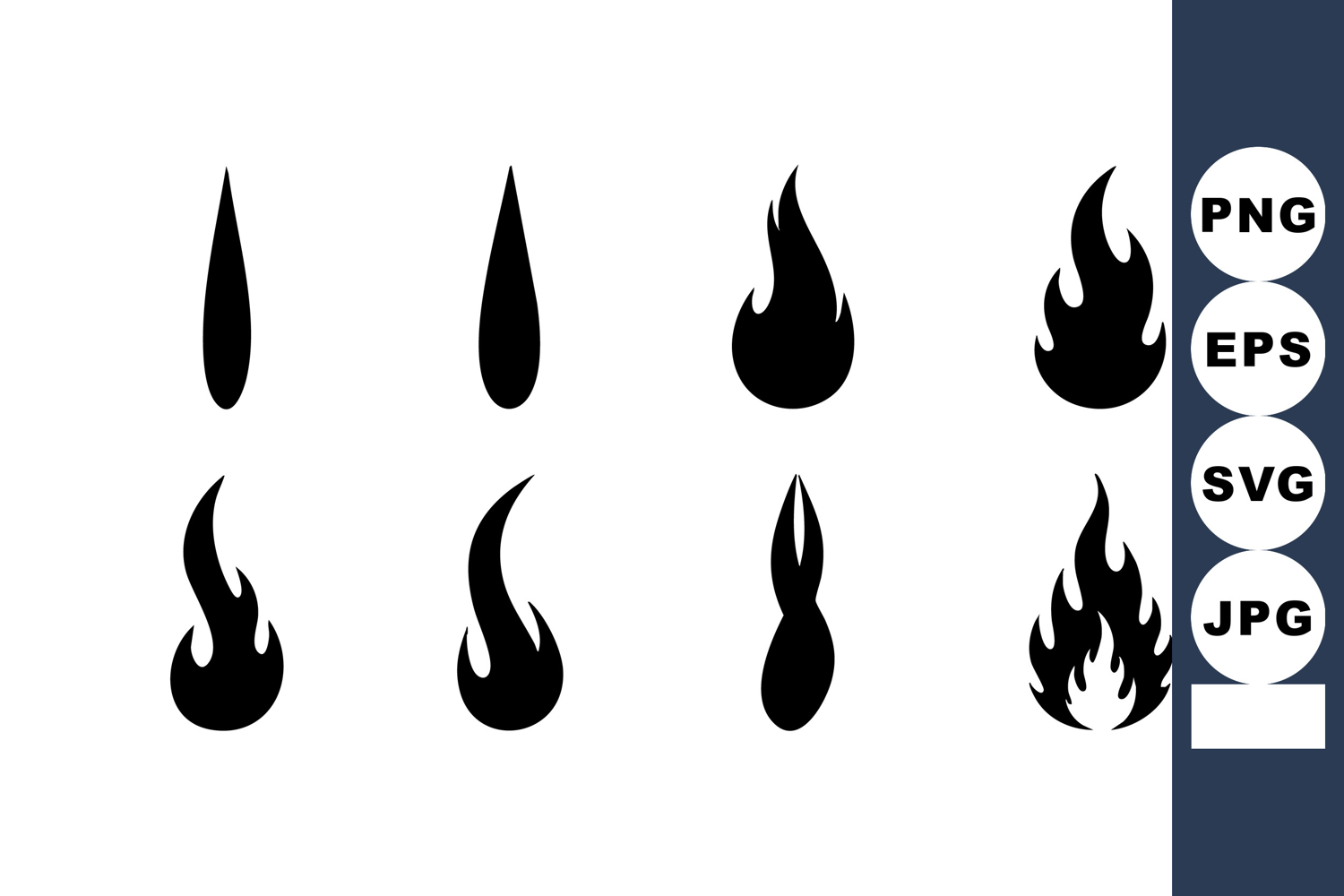 This vector file displays a set of eight black fire flame icons in various shapes and styles representing fire elements with clean design and sharp silhouettes. Modern and bold.