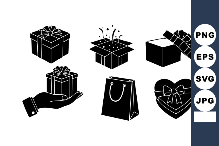 This vector illustration shows six black gift box icons with ribbons in various styles including open box, closed box, hand holding, heart shape, and shopping bag. Simple and clear design with sharp contrast presents a festive mood.