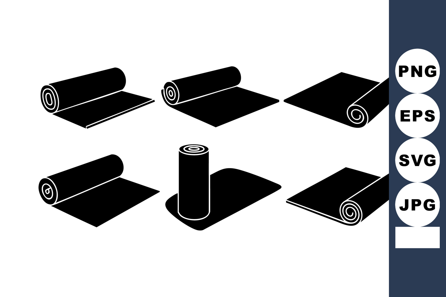 This vector illustration shows six black yoga mat rolls in various positions isolated on a white background representing fitness equipment for exercise and meditation in a simple style calm