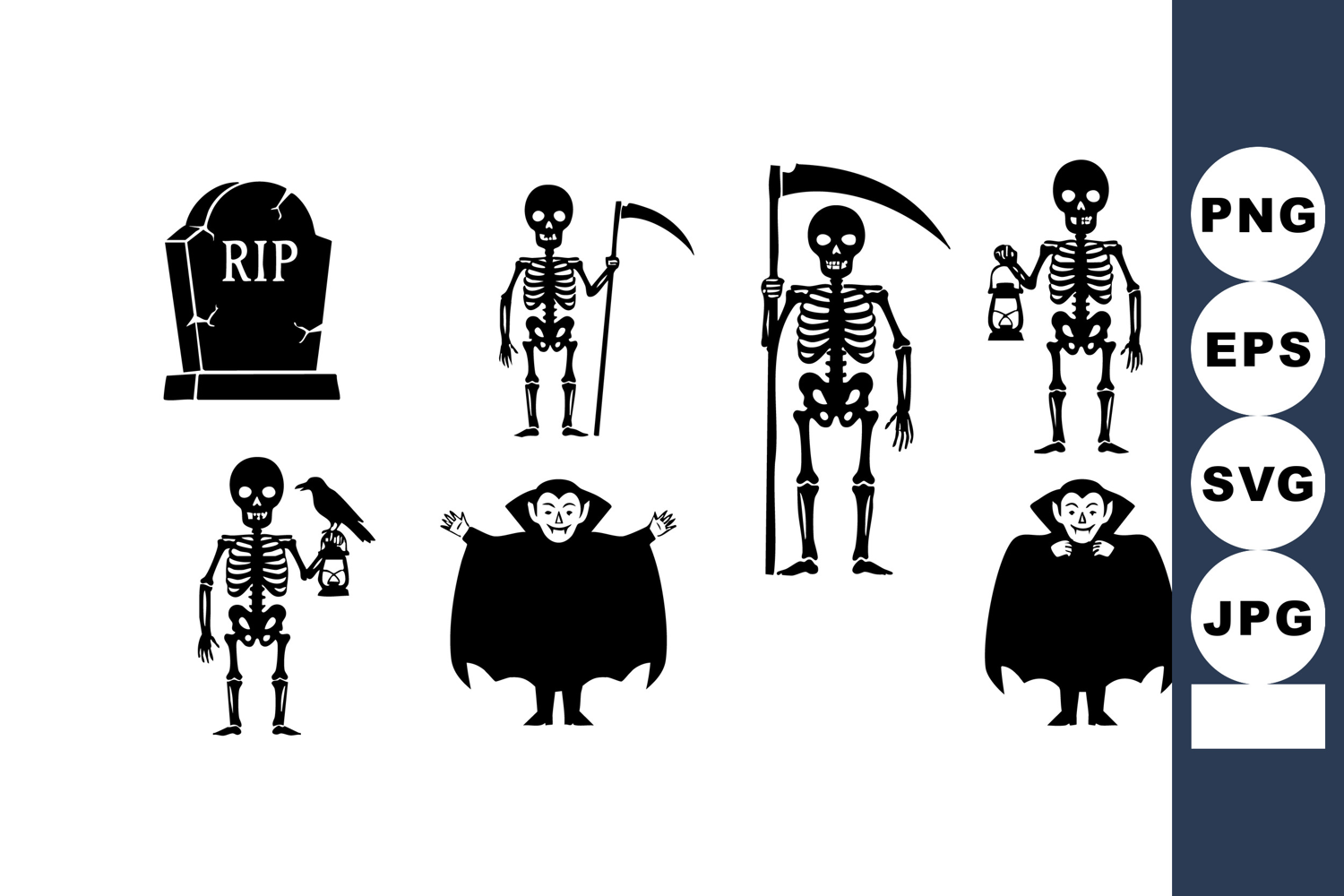 This vector illustration features a spooky Halloween theme with skeletons holding scythes and lanterns, two vampires with capes, and a tombstone marked RIP. The style is cartoonish and fun.