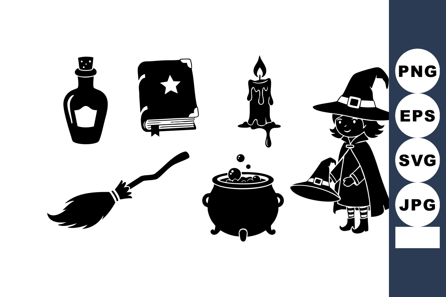 Witch Hat Silhouette Witch Silhouette Design Magic Potion Bottle Magic Hat Vector Witch Potion Bottle Cauldron Candle Flame Broom Witchcraft Spell Book Potion Magic Cauldron Magic Potion Witch Holding Book
