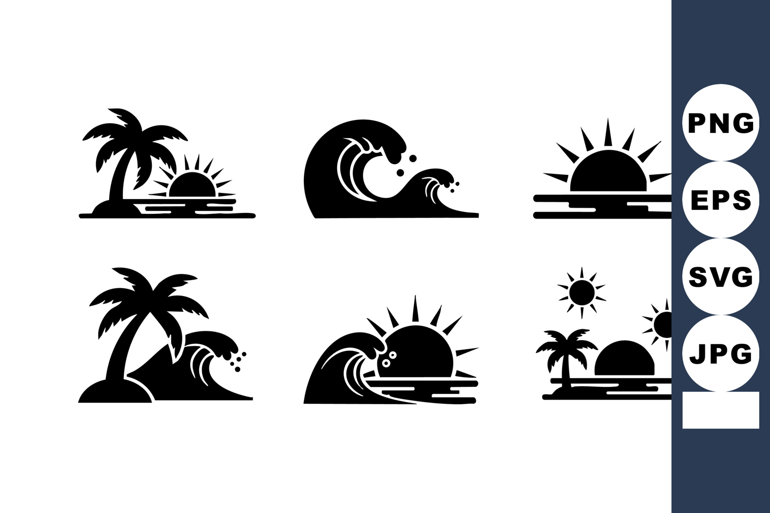 This vector set features black silhouettes of beach scenes including sunsets waves palm trees and islands representing tropical coastal nature in a simple minimal style calm mood