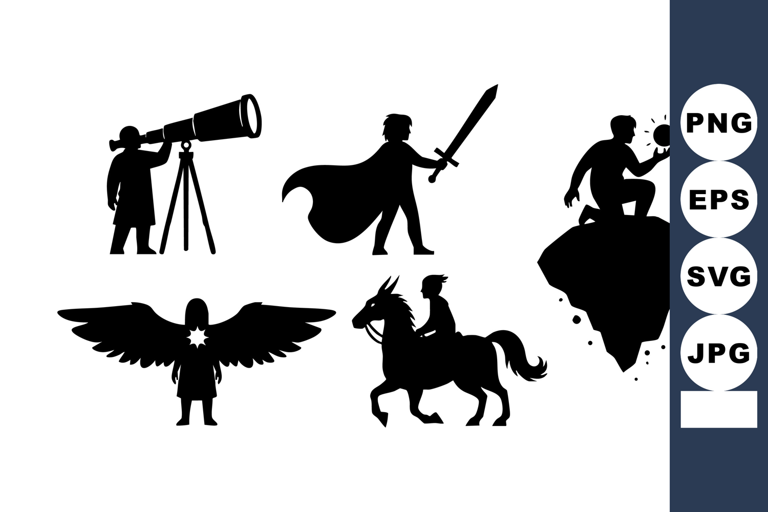 Black Silhouette Figures Silhouettes Of Explorer Explorer With Telescope Hero With Sword Winged Figure Silhouette Horseback Rider Silhouette Thinker On Rock Mysterious Silhouette Pose Adventure Silhouette Characters Fantasy Silhouette Scene