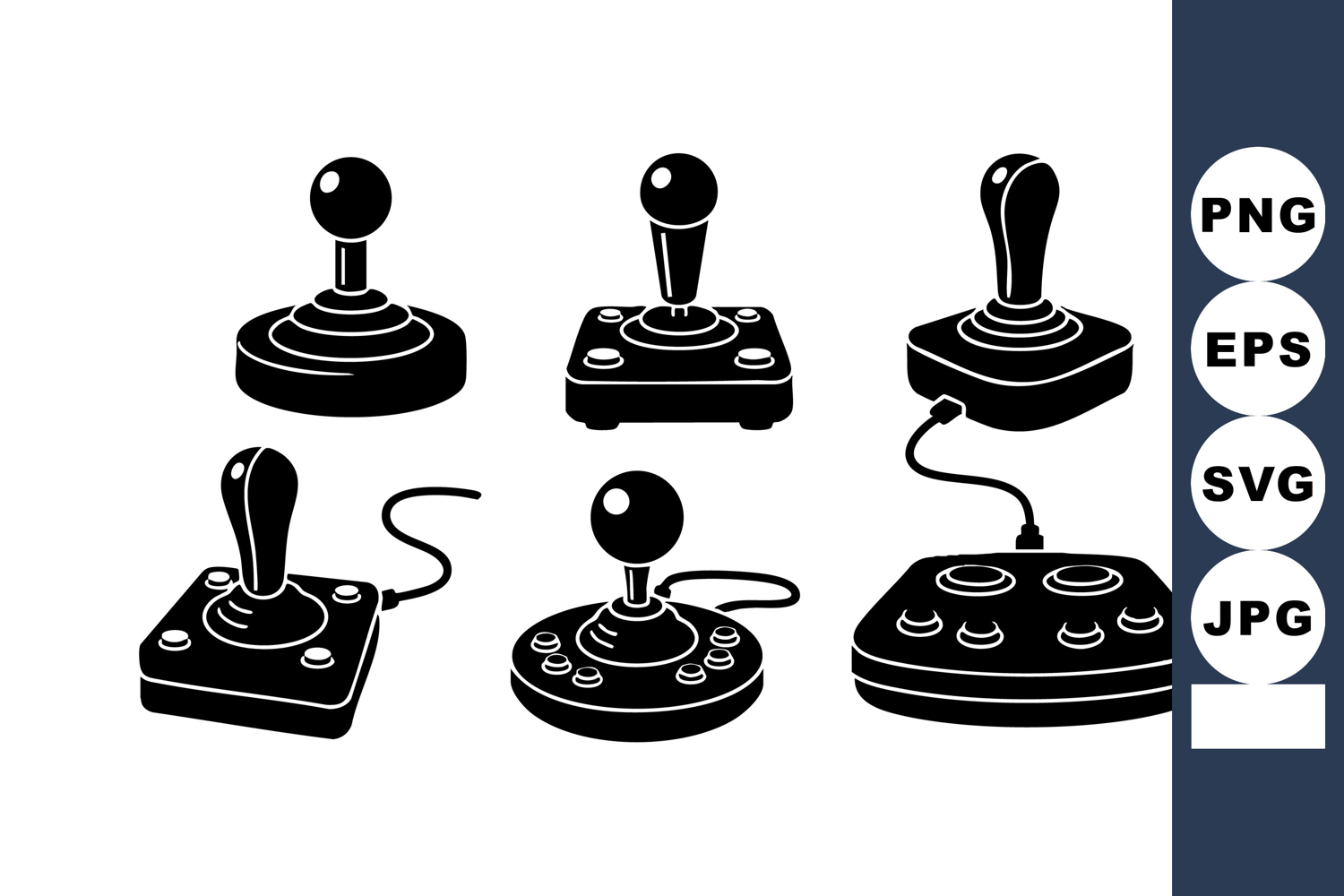 This vector illustration shows a collection of retro joystick game controllers in black silhouette style featuring classic arcade gaming devices with buttons and cables. nostalgic design.