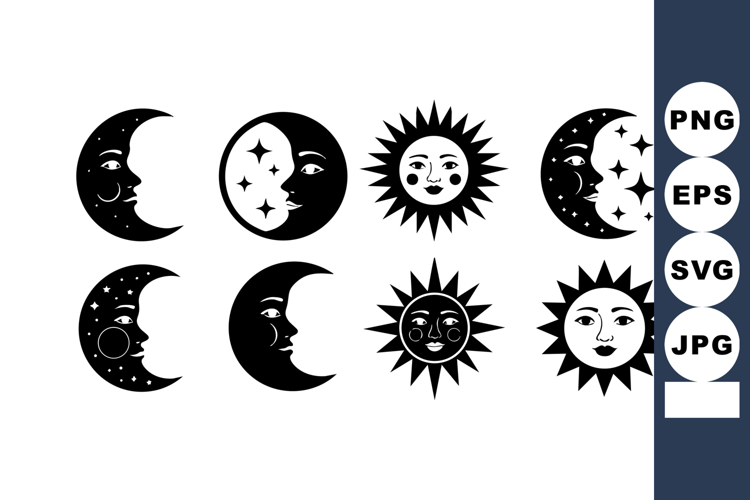 This vector illustration features vintage celestial designs including the moon phases and sun icons in black and white, showing classic cosmic symbolism with a clean style and elegant mood.