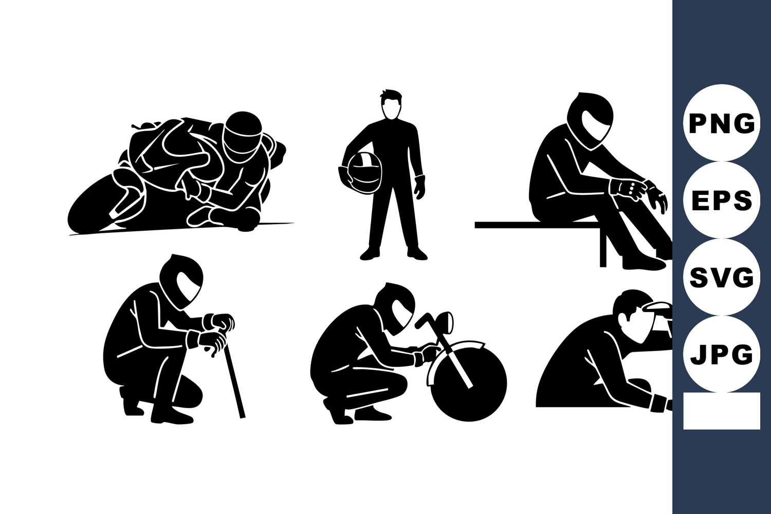 Silhouettes of motorcycle racer with helmet in various positions including riding, standing, sitting, and preparing the motorbike. Clean black shapes convey focus and readiness mood.