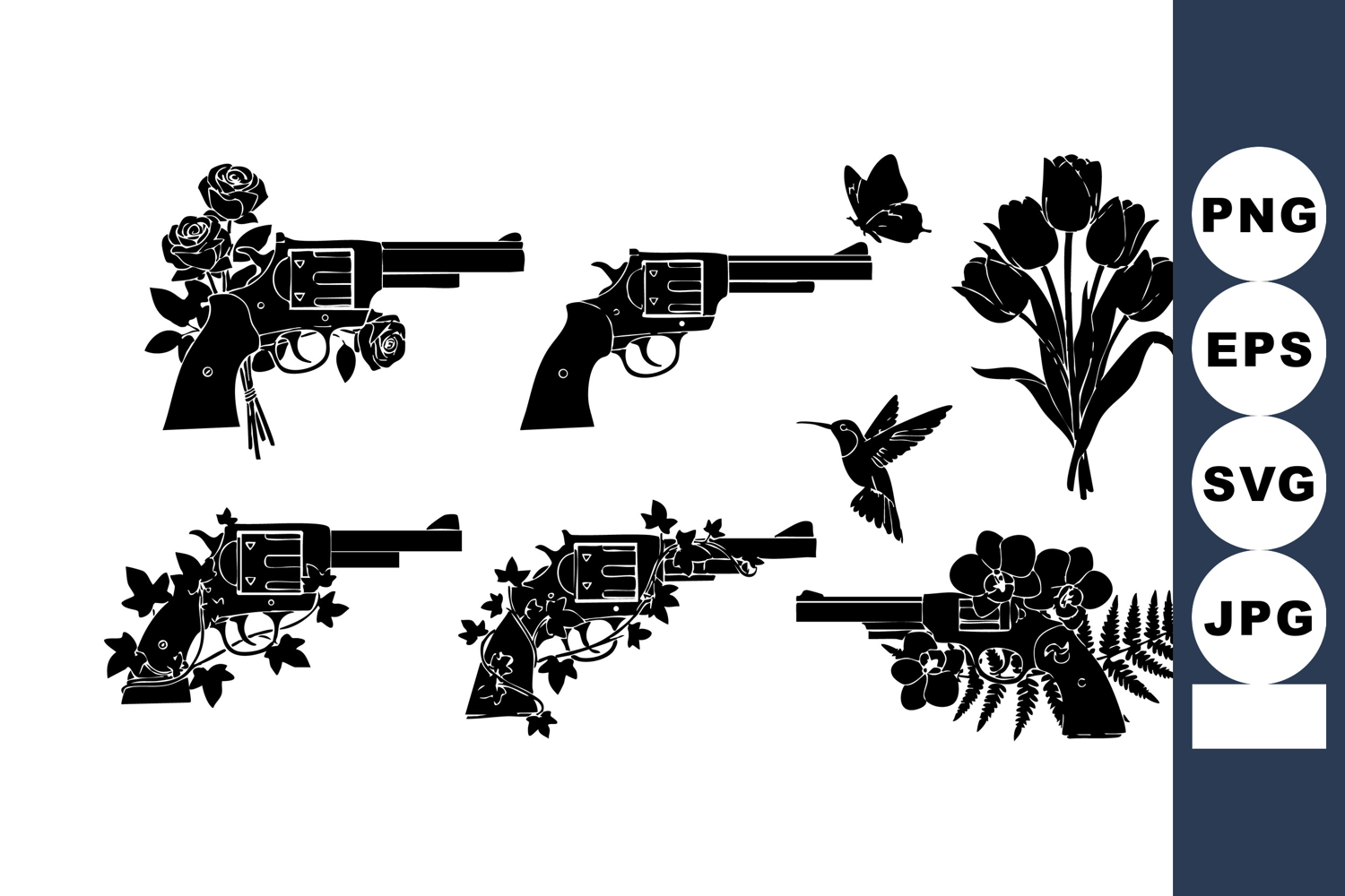 Nature Inspired Design Black Silhouette Vector Vintage Revolver Pistols Floral Bird Silhouettes Artistic Nature Inspired Calm Balanced Mood Flower Rose Tulip Fern Butterfly Hummingbird Decorative Creative Tattoo Classic Floral Vector