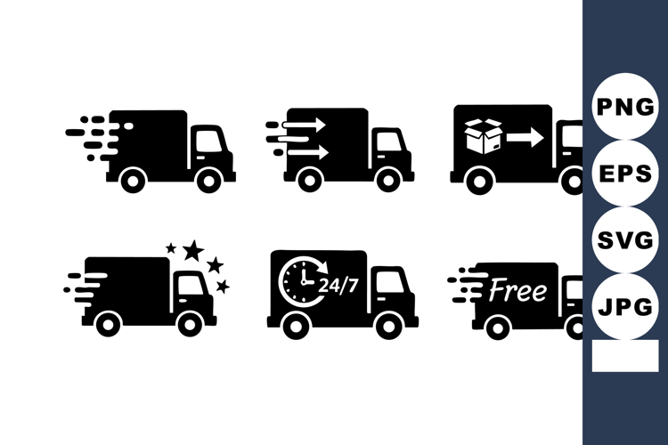 Twenty Four Seven Black Silhouette Icons Fast Shipping Service Delivery Truck Icons Free Shipping Service Express Parcel Delivery Modern Business Theme Shipping Truck Icon Parcel Delivery Service Logistics Company Fleet