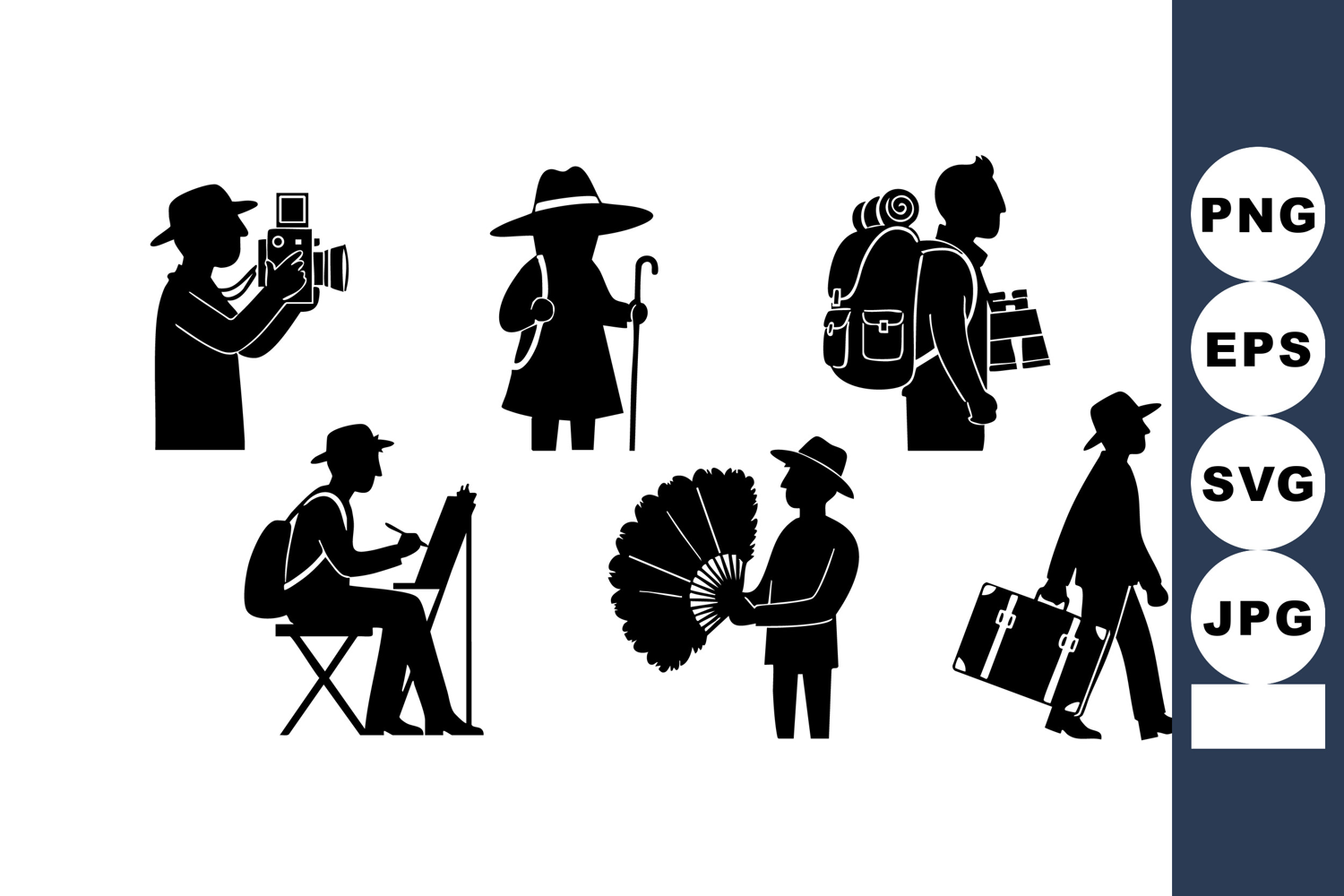 Silhouette vector illustration of travelers in various poses including walking, hiking, sitting, and holding a fan. The image shows adventure and exploration mood.