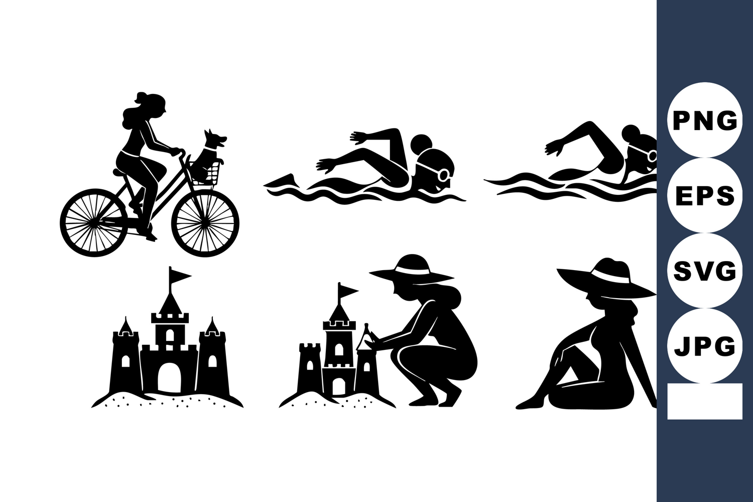 Silhouette Style Vector Woman Riding Bicycle Two Swimmers Swimming Freestyle Swimming Action Woman Building Sandcastle Bicycle Cycling Sport Summer Beach Activity Outdoor Leisure Exercise Vacation Holiday Travel Female Person Figure