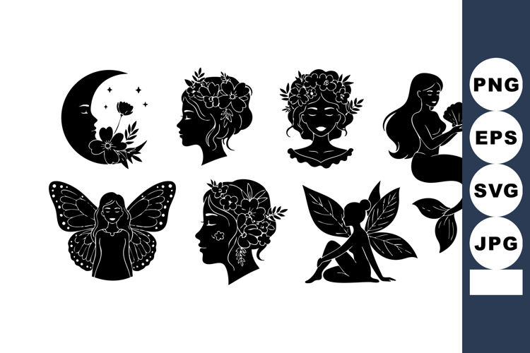 This vector illustration features black silhouette fantasy characters including fairies, a moon, a mermaid, and women with floral elements in a magical and whimsical style. Mysterious mood.
