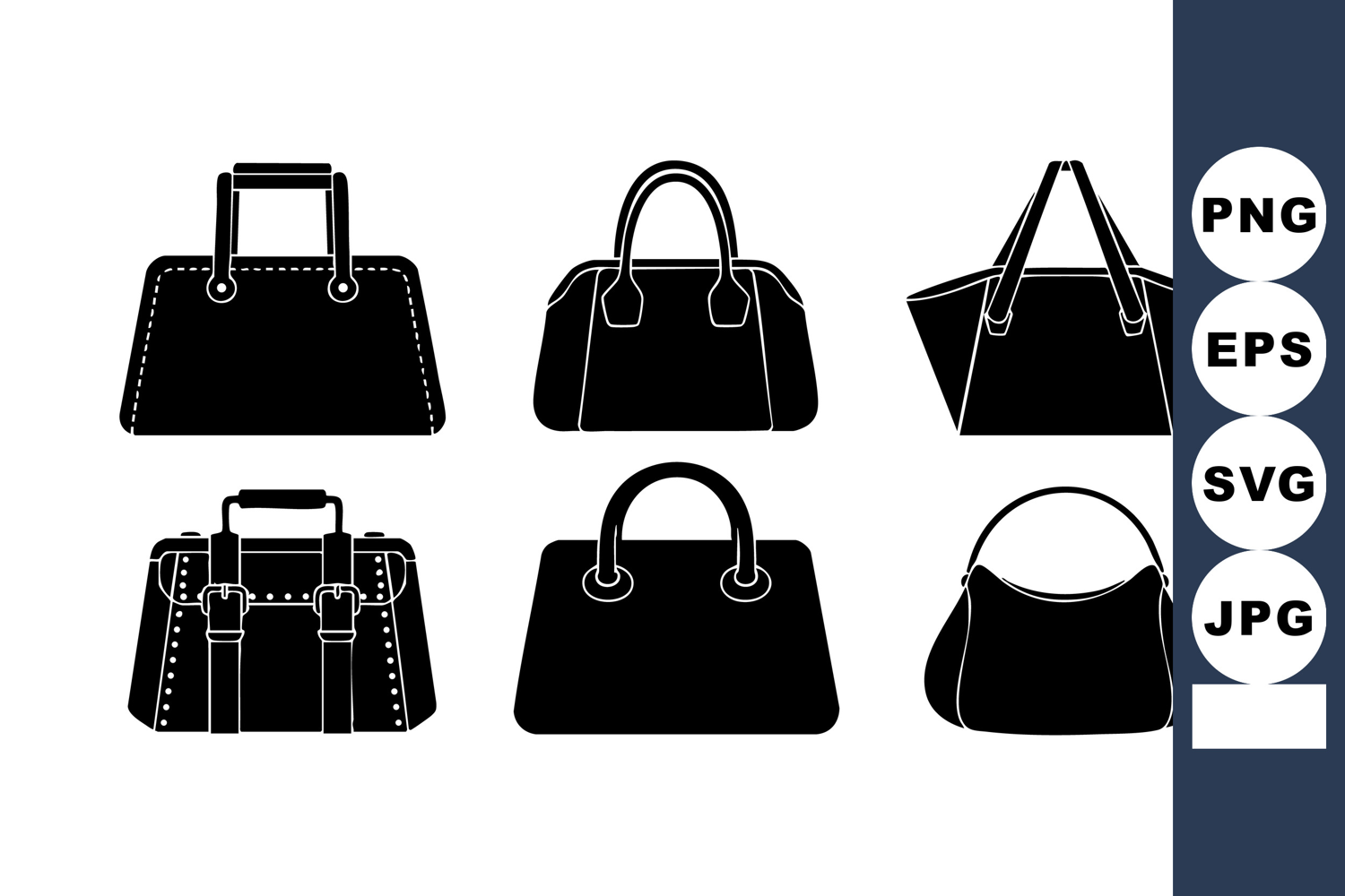 This vector image shows six black silhouette handbag icons in various modern styles including tote, satchel, and shoulder bags. The design is minimal and versatile, elegant.