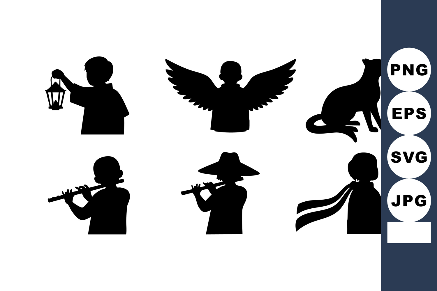 Black Silhouette Vector Children Holding Lantern Playing Flute Wings Dog With Scarf Simple Child Figure Playful Happy Scene Childlike Cartoon Character Musical Instrument Child Animal Fantasy Wings Night Outdoor Magic