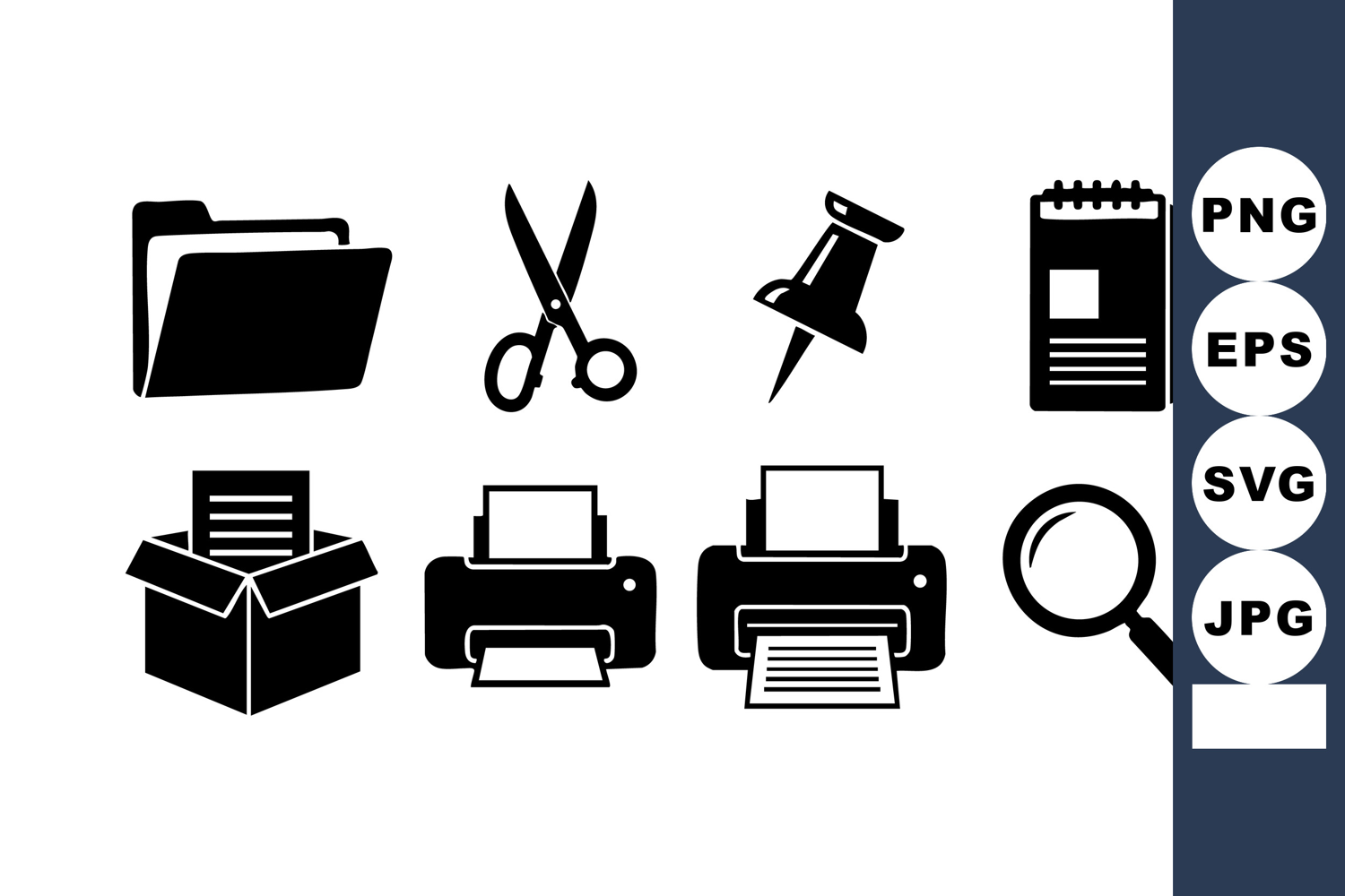 Black And White Simple Style Design Office Tools Icons Folder Scissors Pushpin Newspaper Box Printer Printer And Magnifier Business Organization Graphic Paper Document File Work Organization Tools Vector Illustration Object