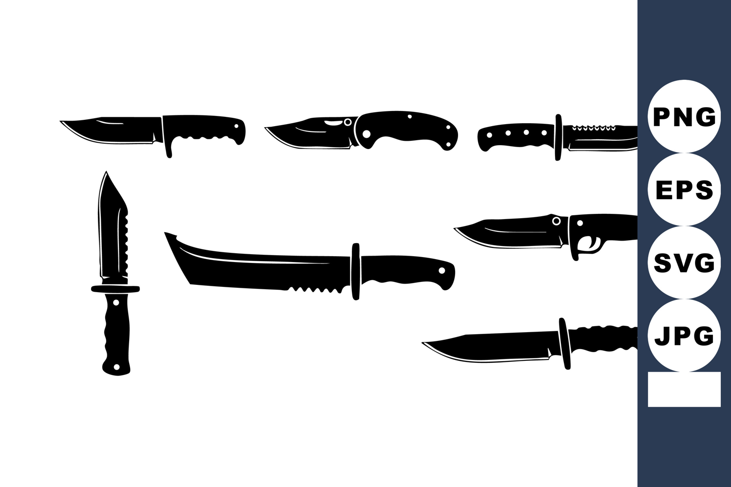 Vector illustration shows seven different hunting knives with sharp blades and tactical handles in solid black silhouette style. Suitable for outdoor and survival themes. Bold and striking mood.