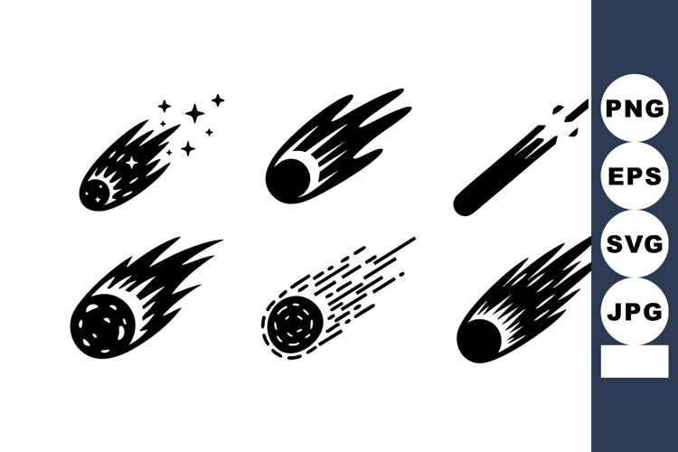 This vector file shows six black meteor and comet illustrations with dynamic trails and star effects in flat style. The design is simple and suitable for space or astronomy themes. Energetic mood.