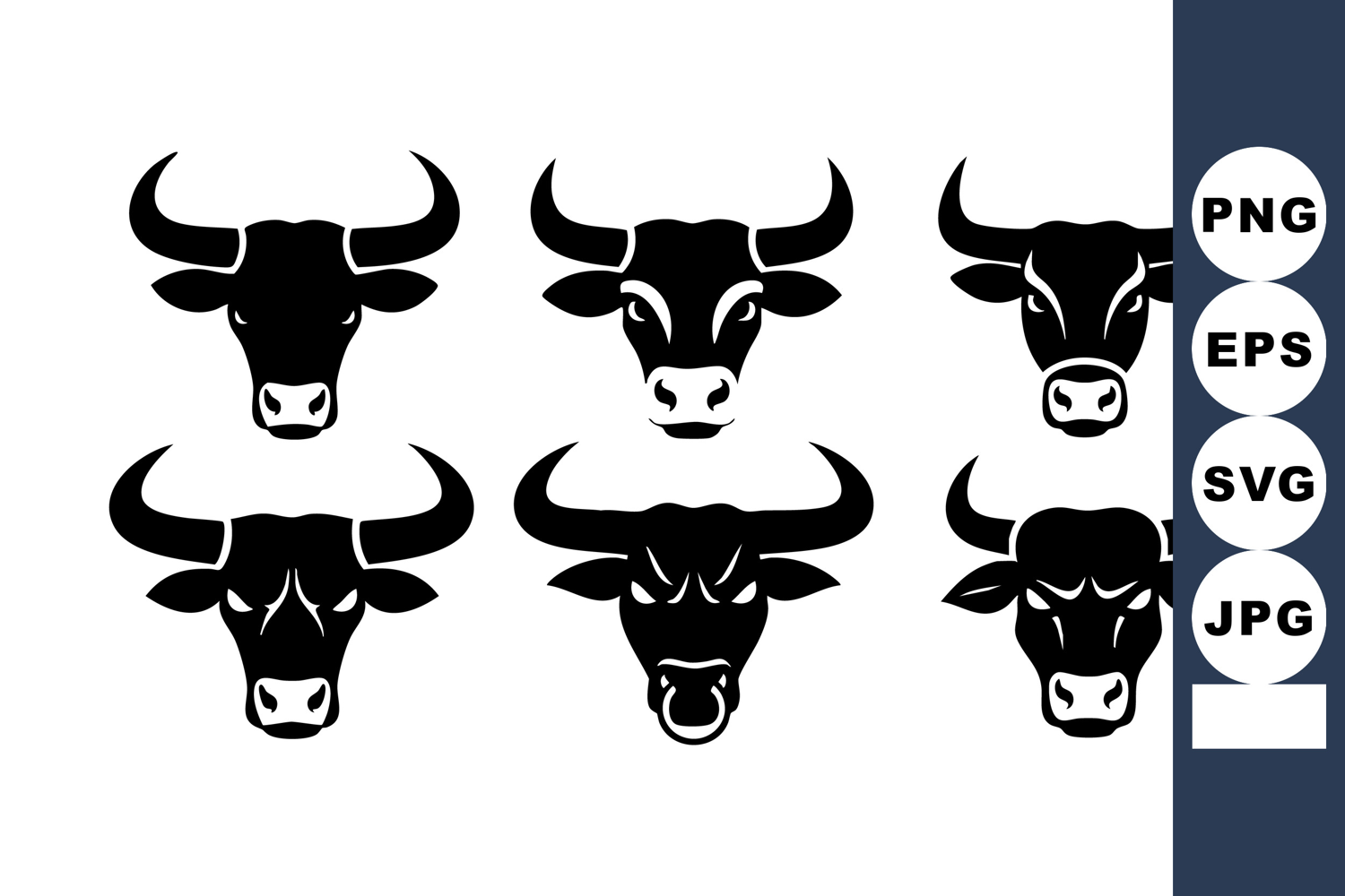 This vector illustration shows six black bull head silhouettes with different horn shapes and facial expressions in a simple flat design style. The image is bold and striking.