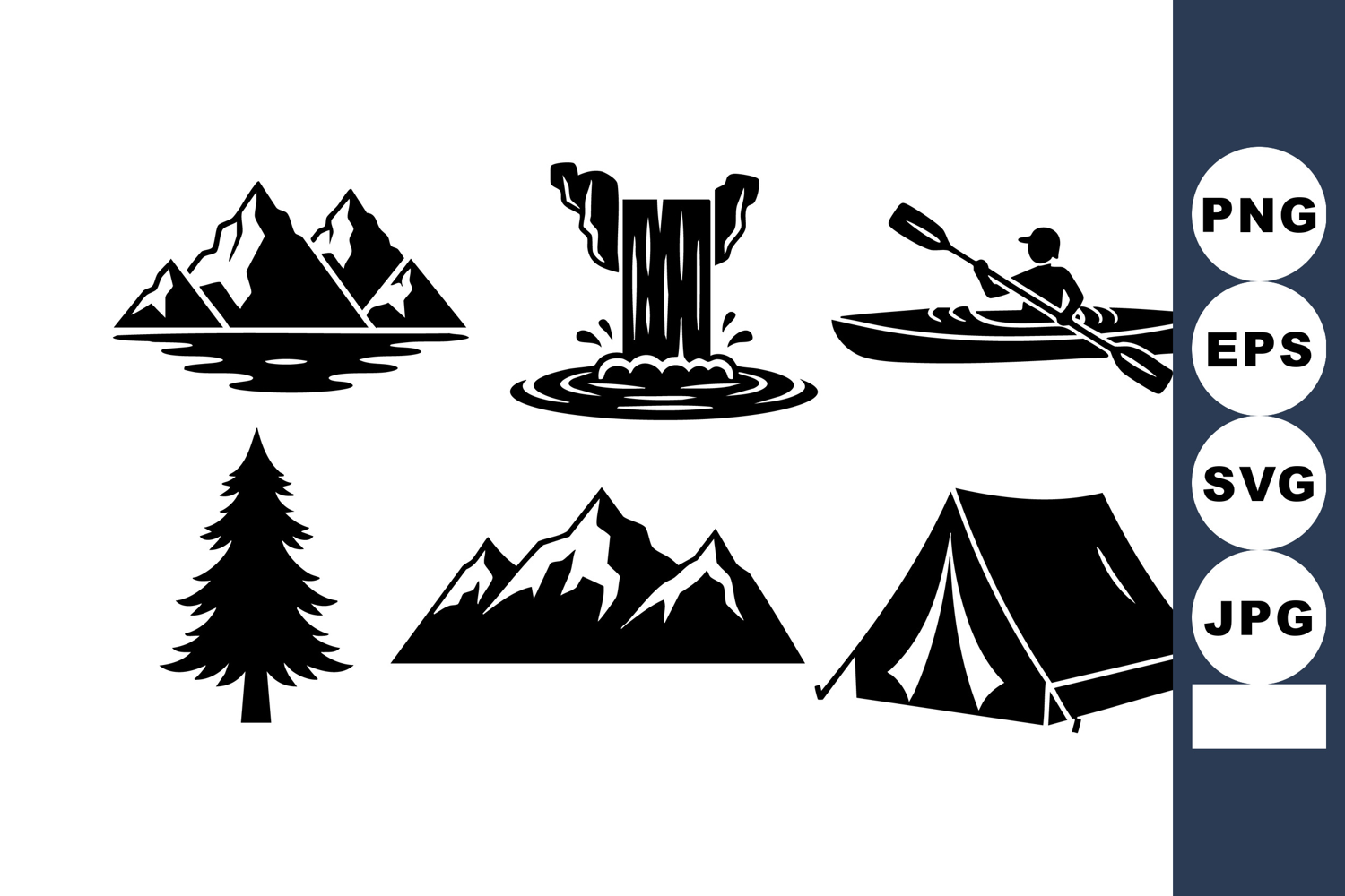 Mountain Peaks Silhouette Mountain Waterfall Kayak Waterfall Flowing Lake Person Kayaking Paddle Pine Tree Camping Camping Tent Outdoor Outdoor Adventure Nature Nature Exploration Vector Lake Water Sport Kayak River Activity