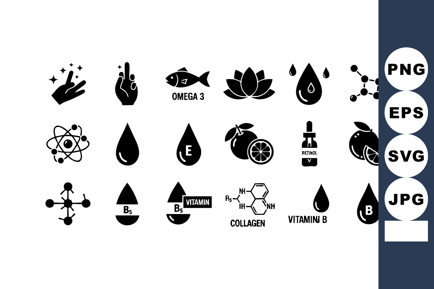 Black Silhouette Style Vitamins Supplements Icons Drops Fruits Molecules Collagen Symbols Vector Natural Organic Science Health Nutrition Wellness Antioxidant Immune Health Skincare Hydration Vector Pharmaceutical Chemical Structure Healthy Living Beauty
