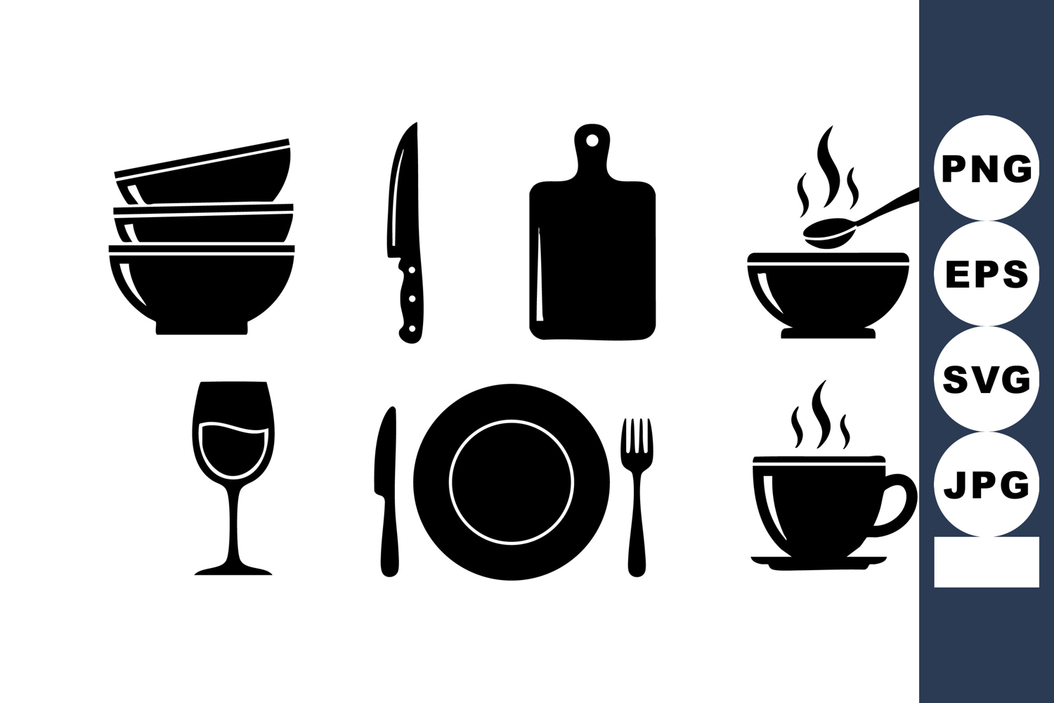 Wine Glass Icon Hot Beverage Cup Black Silhouette Icons Knife Cutting Board Kitchen Utensils Set Tableware With Bowls Plate Cup Glass Cooking Meal Utensils Restaurant Dining Items Minimalist Tableware Set