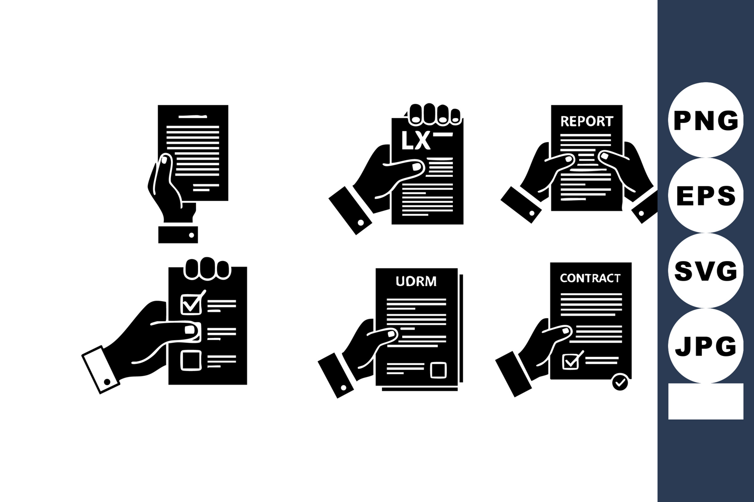 This vector illustration shows black and white icons of hands holding different documents including checklist, report, contract, and form in a simple style. Clear and professional mood.