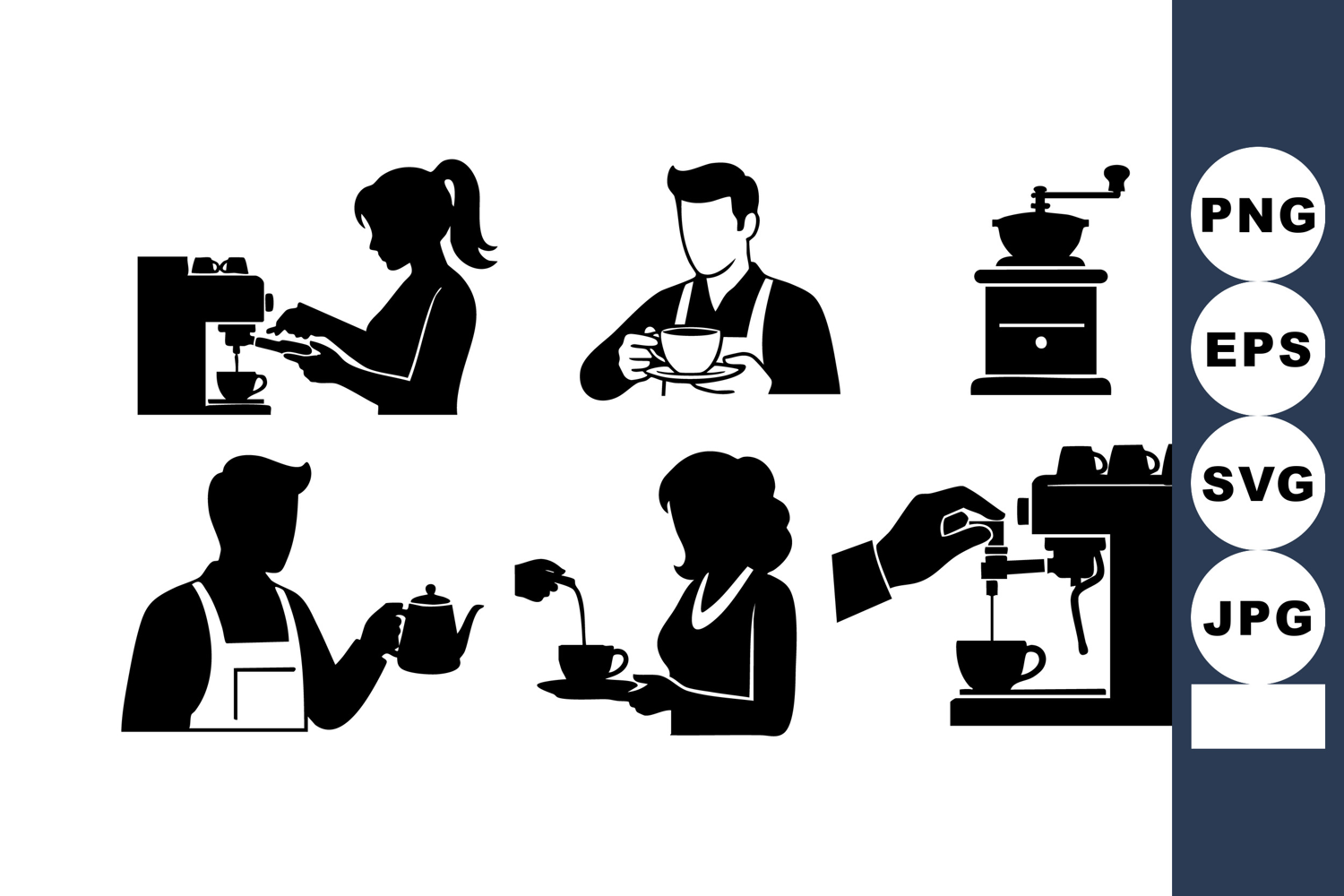Simple Black Vector Coffee Making Process Barista Man Woman Espresso Machine Grinder Pouring Serving Actions Hot Drink Preparation Coffee Cup Drink Barista Worker Apron Coffeehouse Morning Drinker Restaurant Hospitality Service