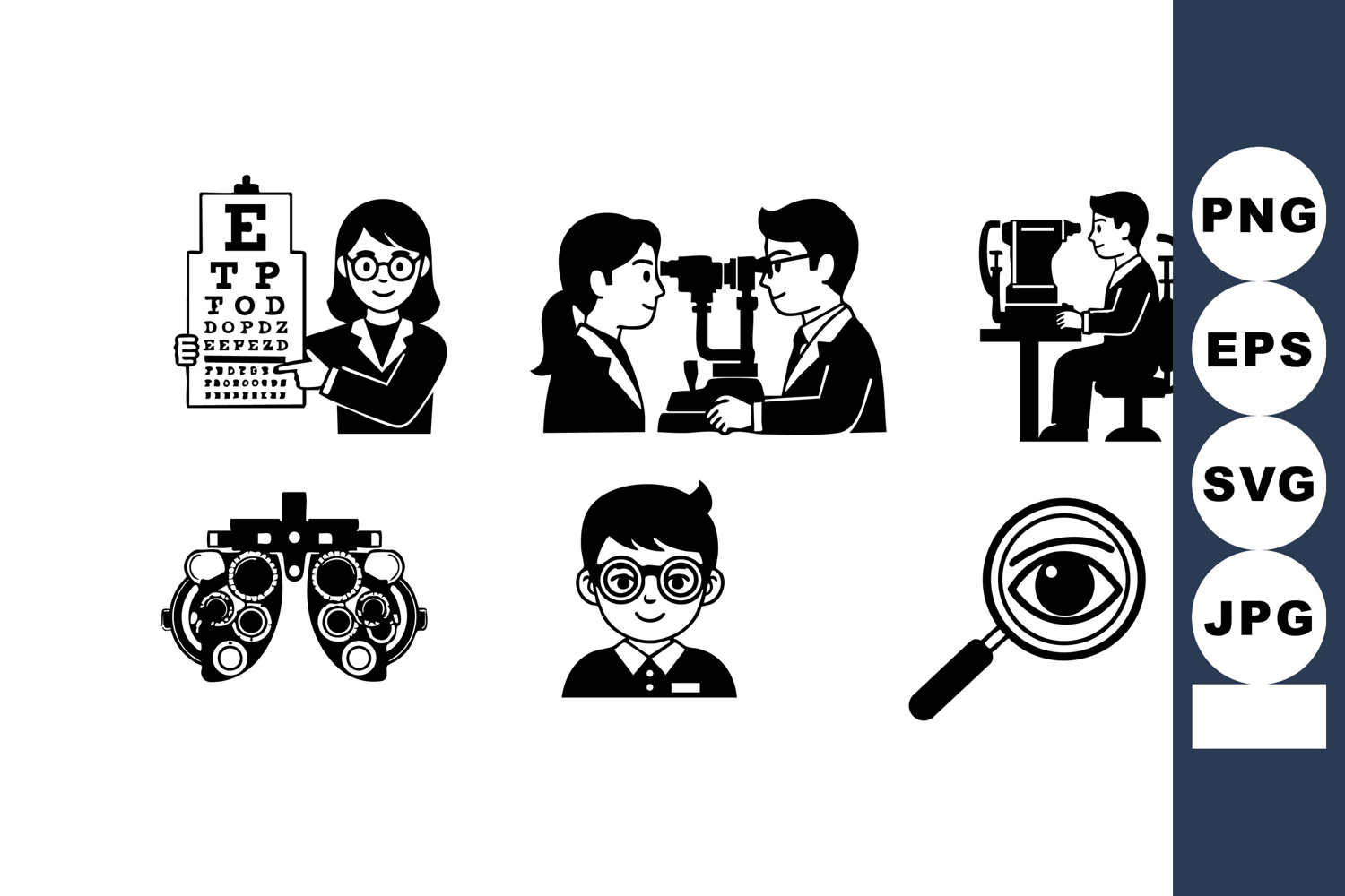 Vector illustration showing various eye examination scenes including vision testing charts optometry tools and patient doctor interactions in black and white style professional and clear