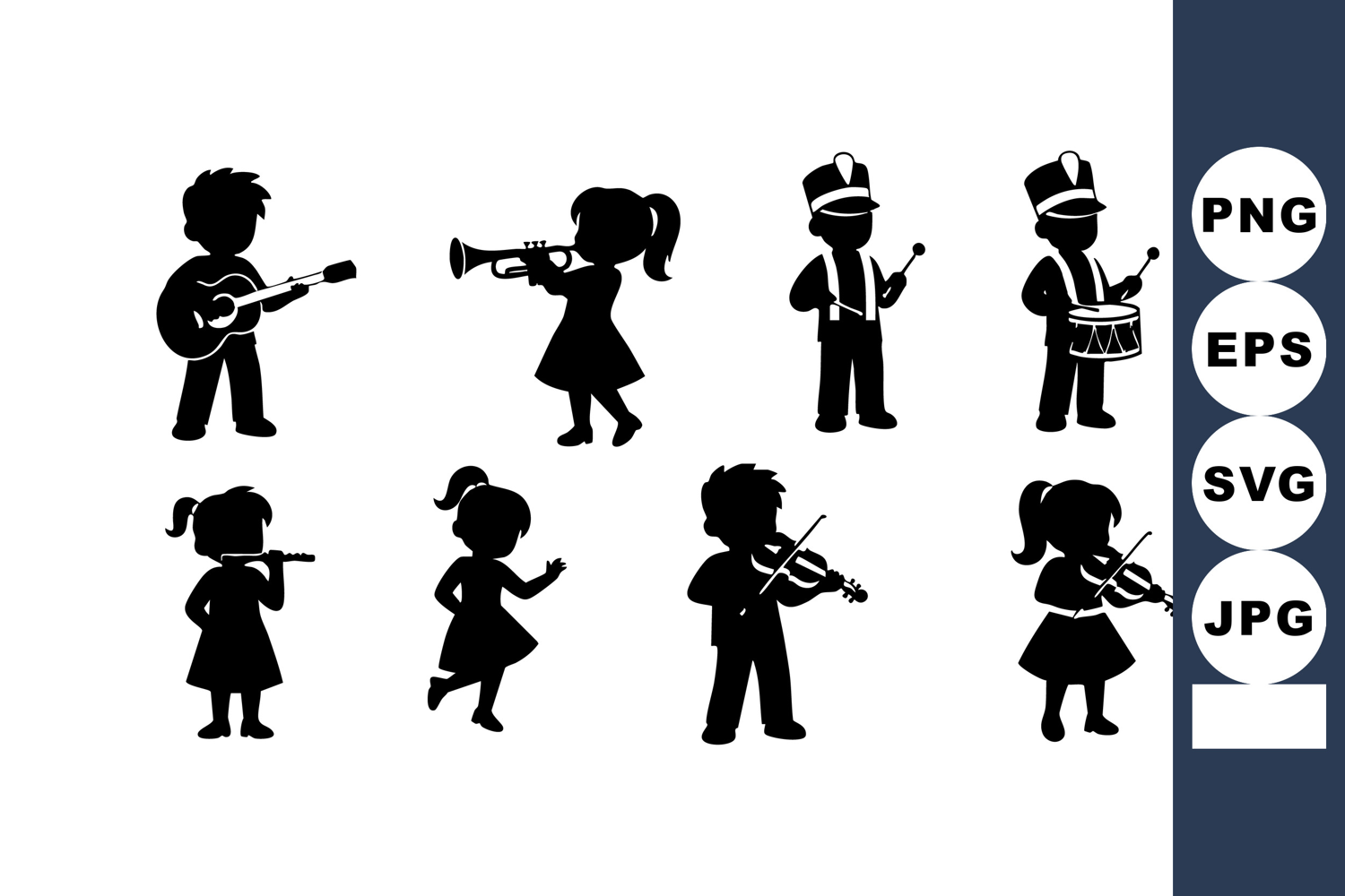 Musical Instruments Silhouette Kids Playing Music Children Playing Guitar Children Playing Trumpet Children Playing Violin Children Playing Drums Children Music Band Young Musician Playing Children Performance Art Musical Children Group