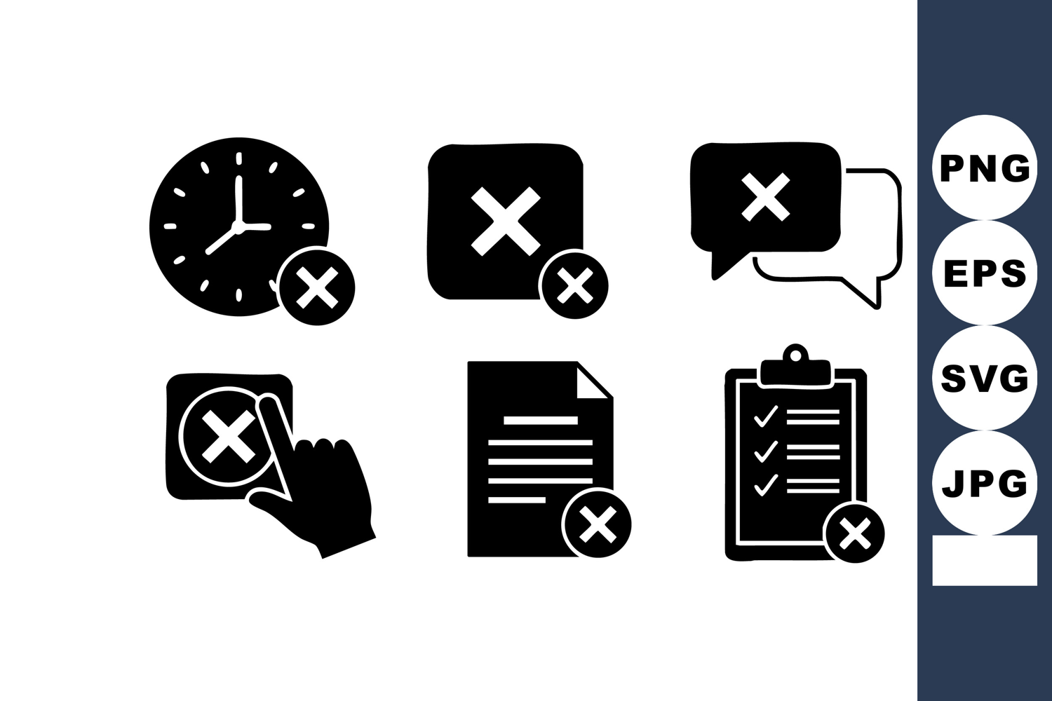 This vector image shows six black error icons including clock, document, checklist, hand pointer, and chat symbols with cross marks. It presents a simple flat design style, minimalistic and clear mood.