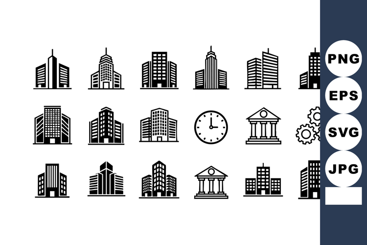 Vector image showing various business buildings office icons in black silhouette style with urban skyline and architecture elements suitable for design projects professional and modern mood