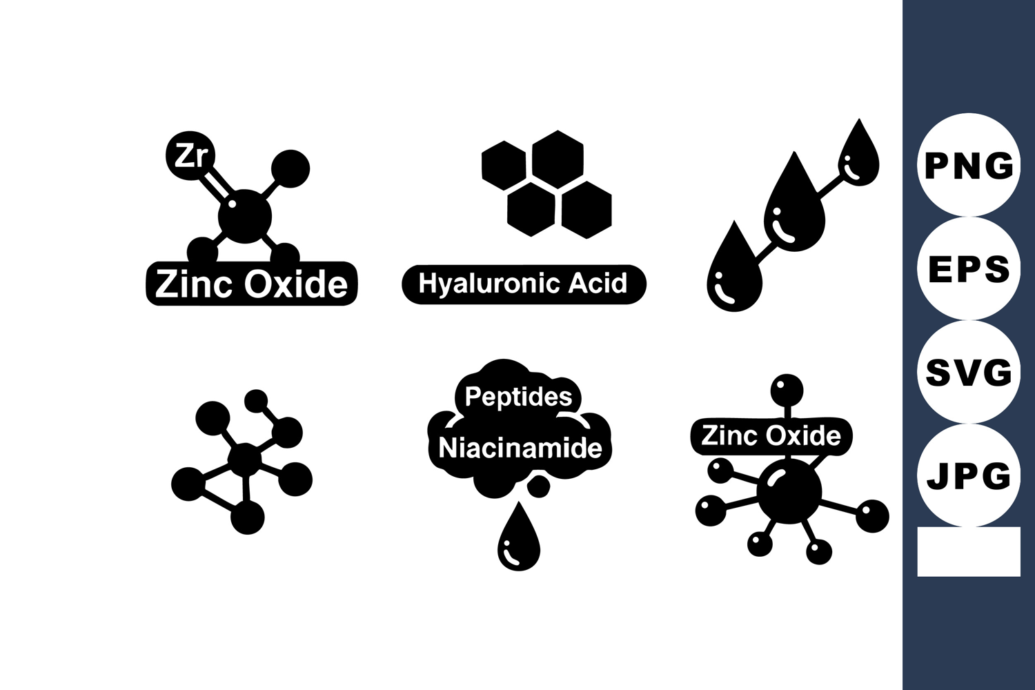 Zinc Oxide Molecule Hyaluronic Acid Drops Peptides Niacinamide Skincare Skincare Ingredient Vector Molecular Structure Icon Black Skincare Icons Beauty Serum Formula Cosmetic Ingredient Symbols Health Science Graphic Vitamin Skincare Care