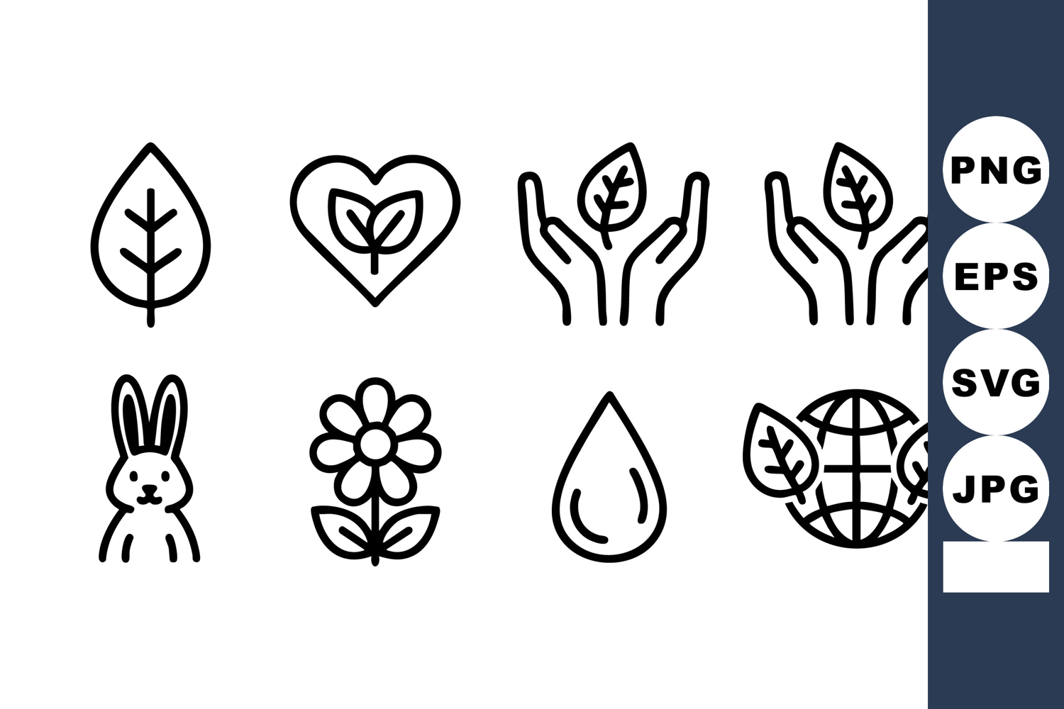 This vector illustration shows eco friendly icons including leaf, heart with leaves, hands holding leaves, rabbit, flower, water drop, and globe with leaves representing environment protection and care. Calm and hopeful.