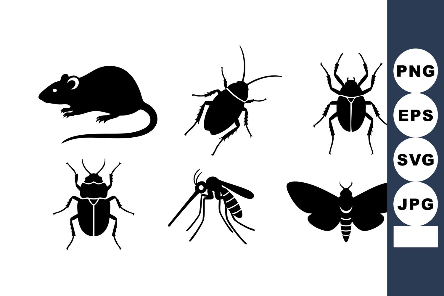 This vector illustration features black silhouette images of a rat, beetles, mosquito, and moth in a simple style for versatile design use calm.