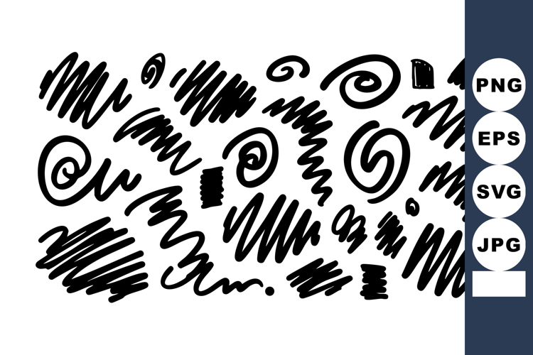 This vector illustration features abstract black ink scribbles and doodles in various shapes and styles scattered randomly on a white background creating a chaotic artistic mood.