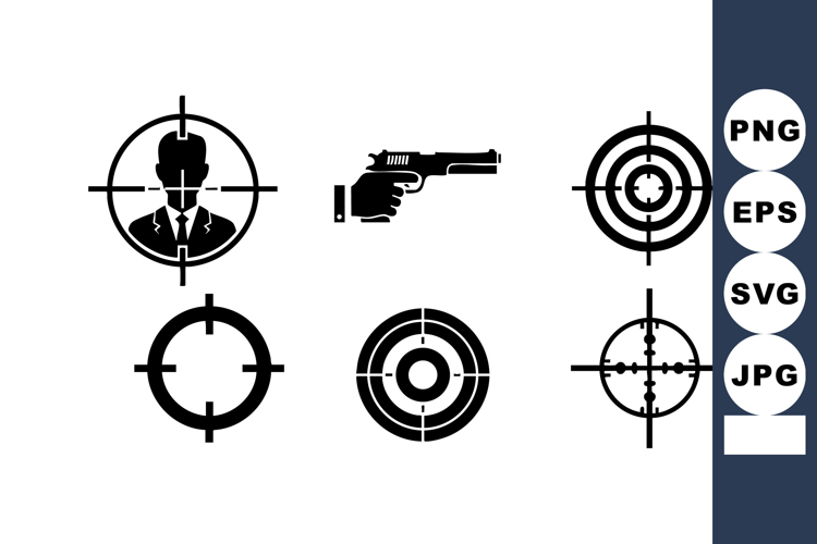 This vector illustration shows six black target symbols including a businessman silhouette, a gun, and various crosshair designs in a simple style. The icons convey focus and aiming concepts. Precise mood.