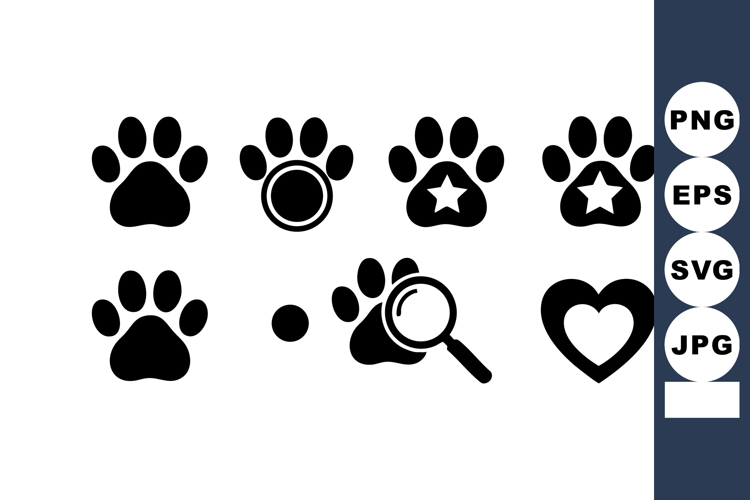 This vector file shows black paw prints icons including a heart shape and magnifying glass detail in a clean simple style perfect for pet or animal themes calm and friendly mood.