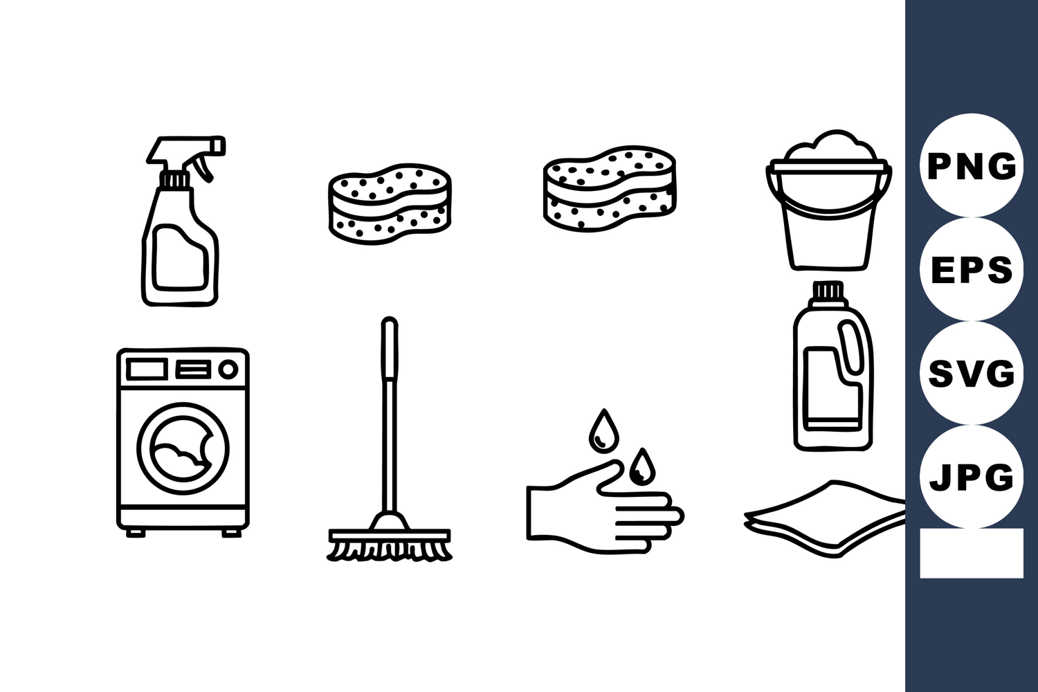 Black line art vector showing essential cleaning tools including spray bottle mop hand washing sponges bucket detergent cloth and washing machine in minimal style calm