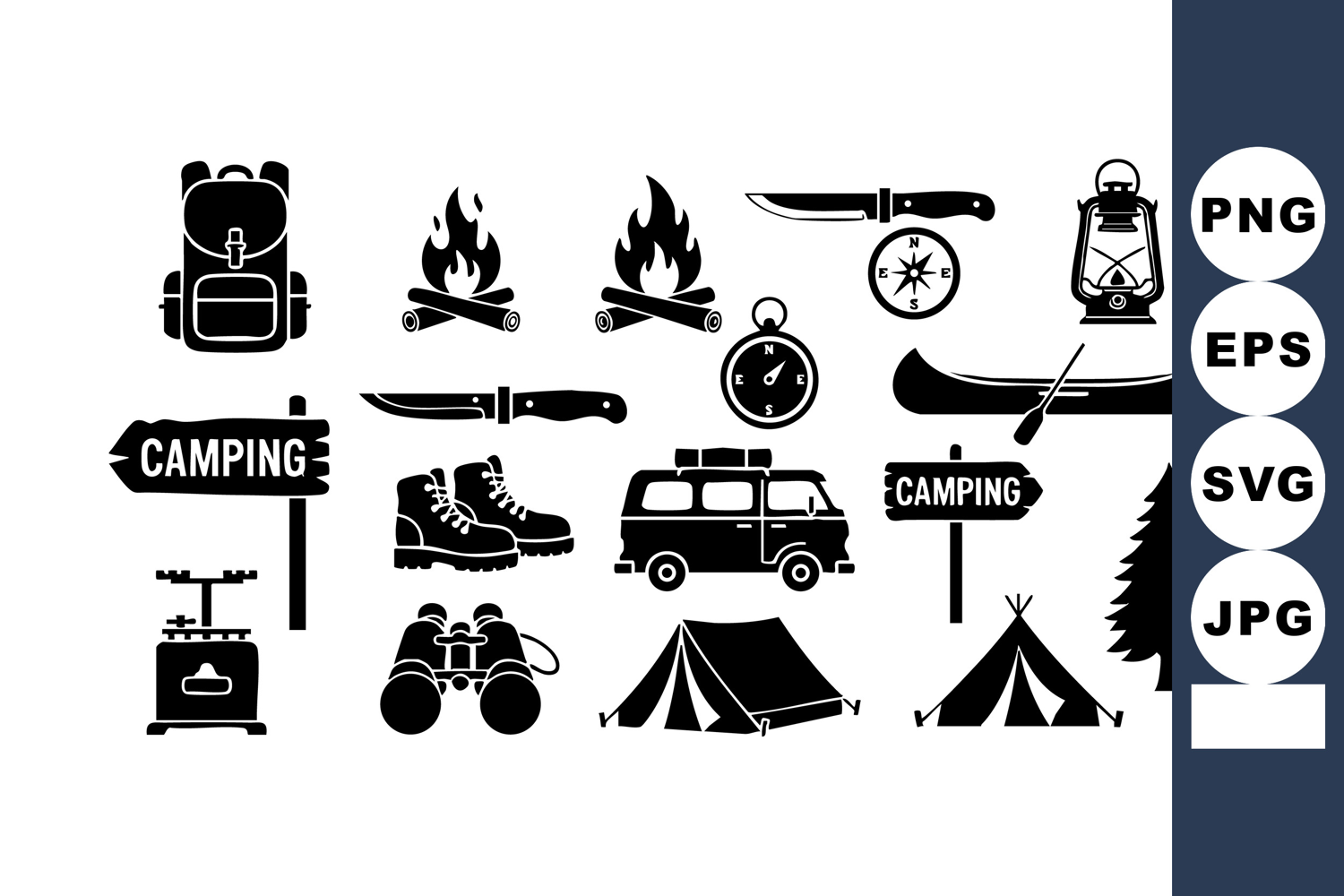 This vector illustration shows various camping outdoor adventure icons including tents campfires knives compass backpacks canoe boots binoculars and a van in black silhouette style calm mood
