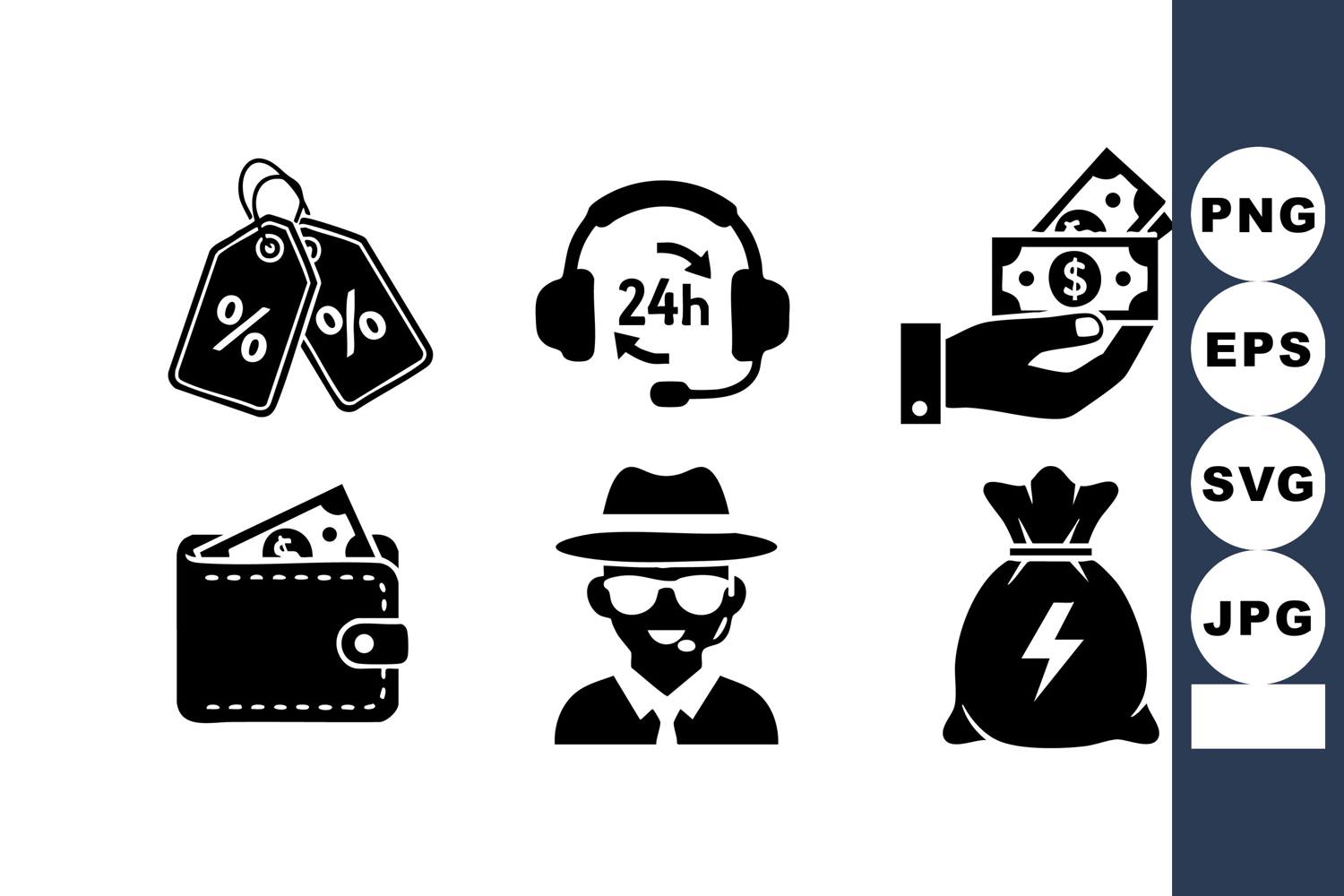 Customer Service Headset Man With Glasses Black Silhouette Icons Money Discount Tags Hand With Cash Wallet With Money Anonymous Man Hat Thief Sack Lightning Discount Percent Sign Support Call Center