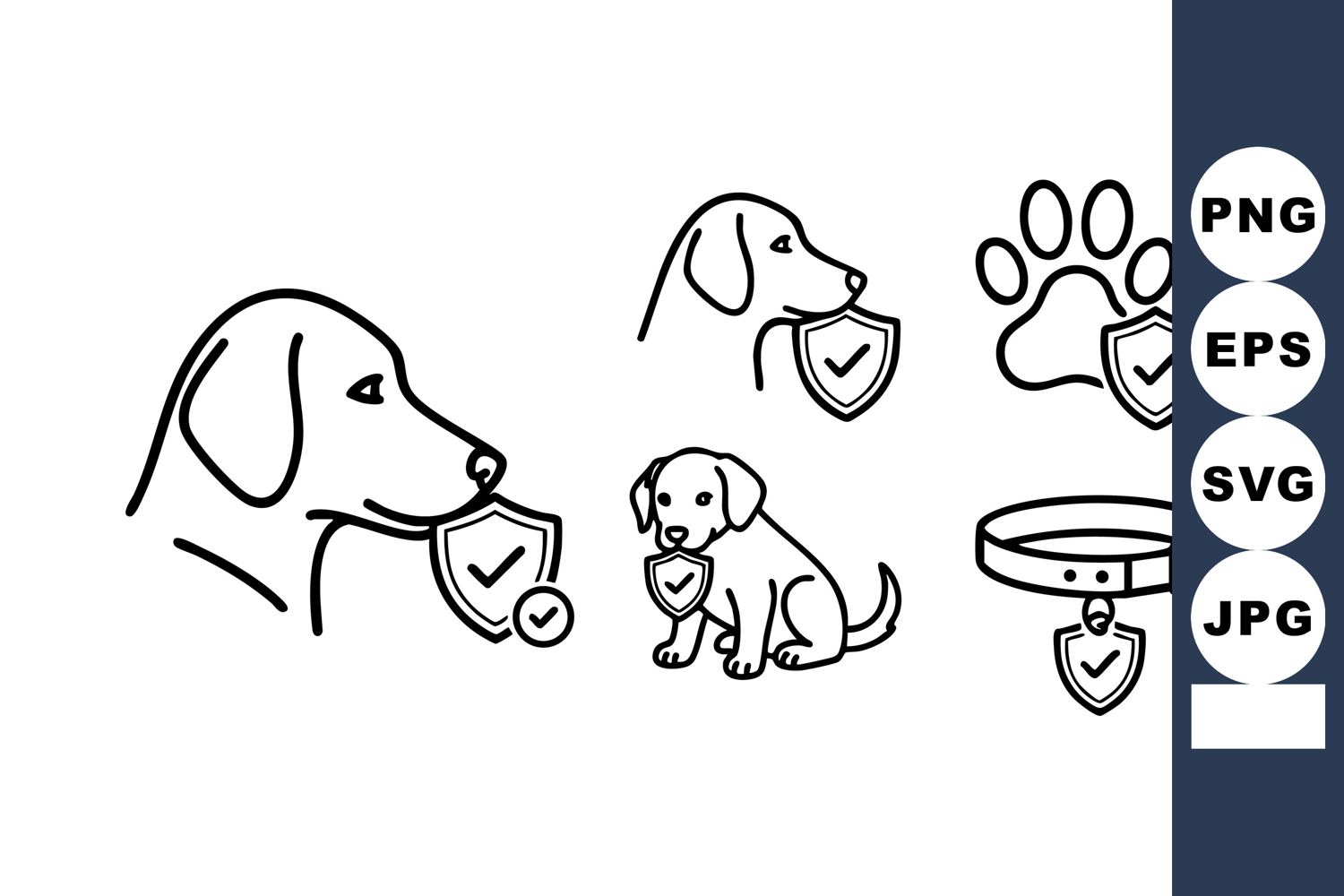 This vector illustration features dog icons with shield symbols representing pet protection and safety including a collar and paw design in simple black outline style calm